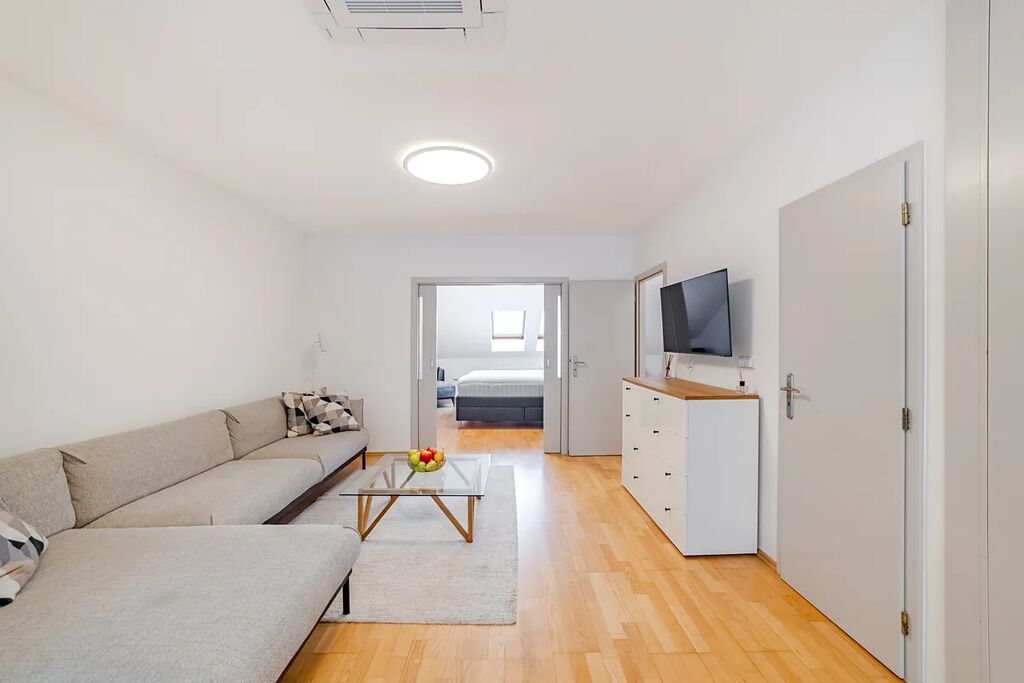 Dispozice zahrnuje prostorný obývací pokoj s plně vybavenou kuchyňskou linkou, ložnici v patře, dvě koupelny, samostatnou šatnu a balkon. K bytu náleží klimatizace pro maximální komfort během letních měsíců.