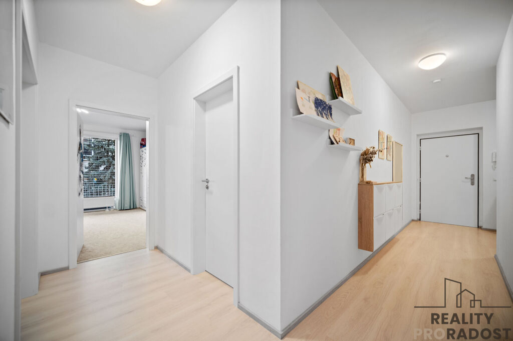 Byt má širokou vstupní chodbu, ze které se vchází do všech samostatných místností. Součástí je prostorná šatna a technická místnost s přípravou na pračku a sušičku. Dále je zde koupelna s vanou a toaletou a druhá samostatná toaleta.