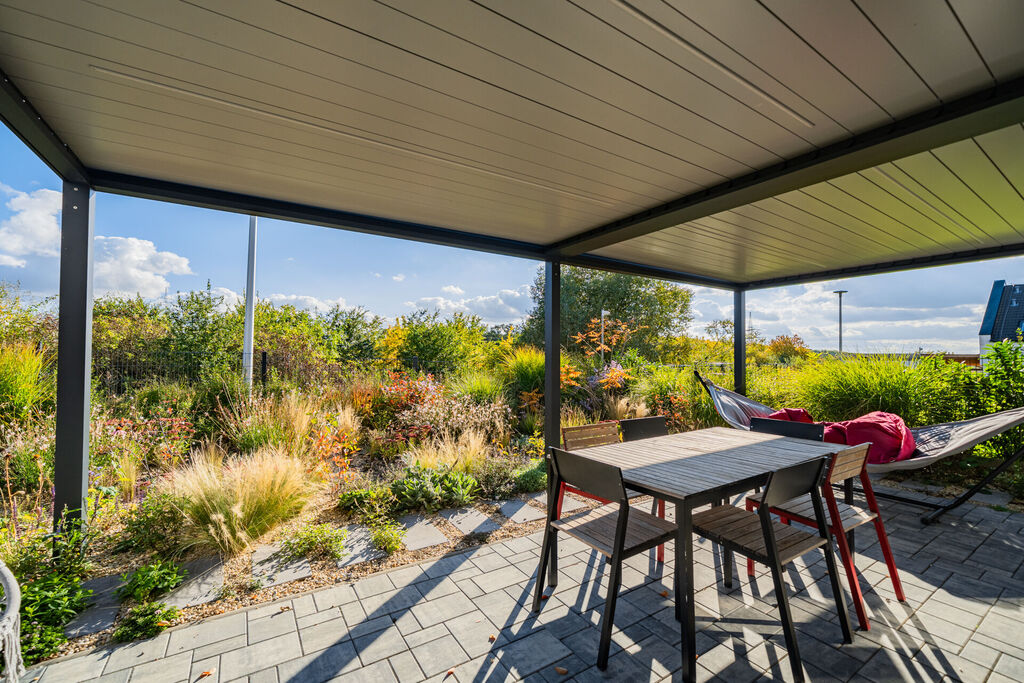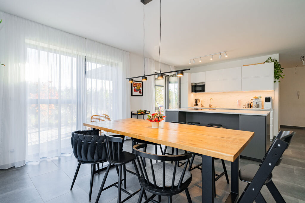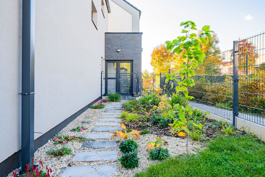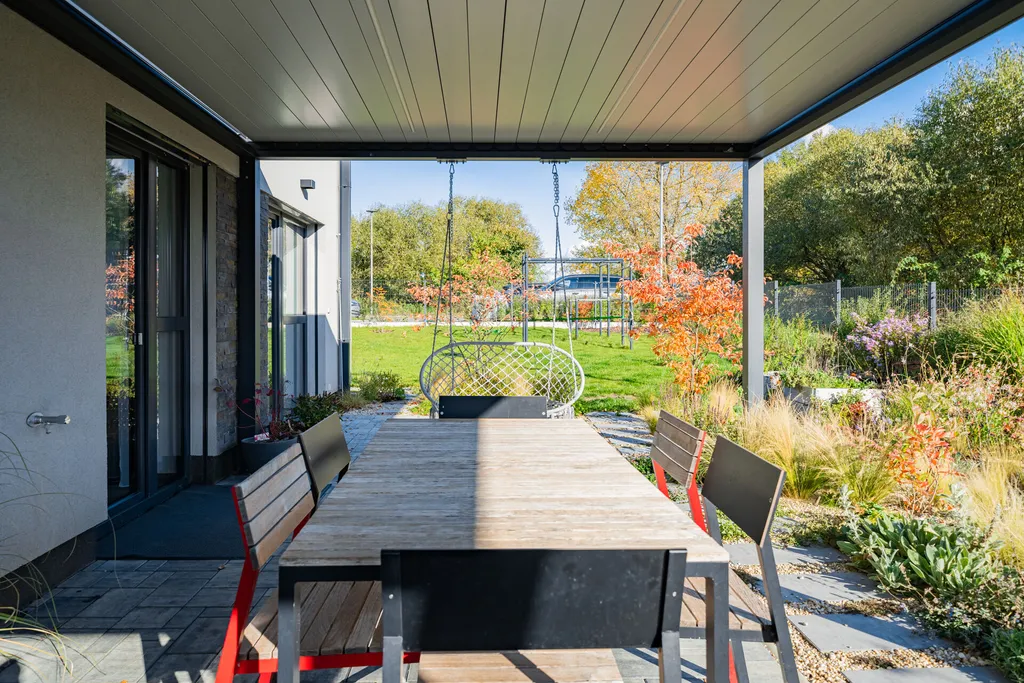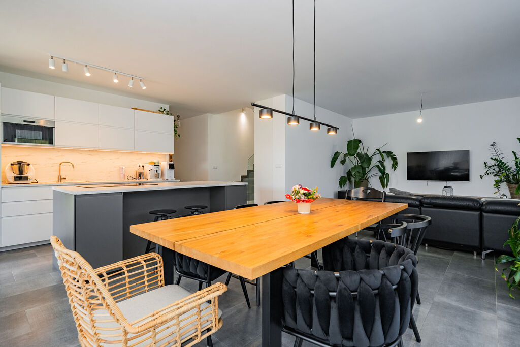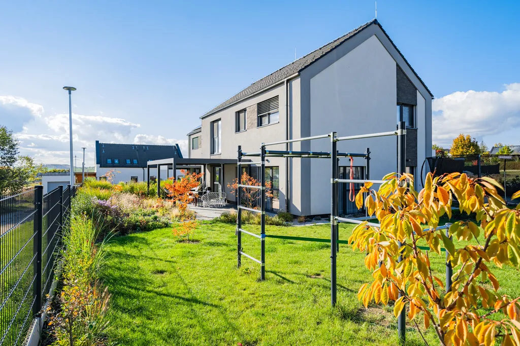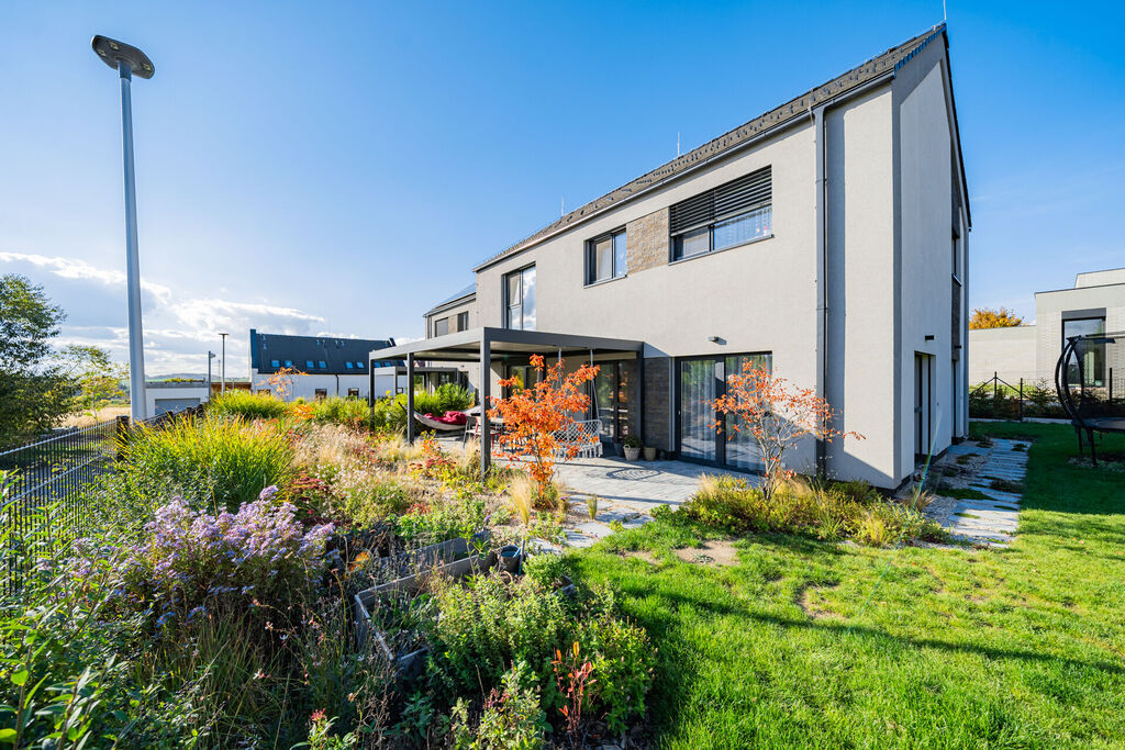 V přízemí Vás okouzlí velkorysý obytný prostor se vstupem na terasu s pergolou a do dále do zahrady, který moderně propojuje obývací pokoj, jídelnu a kuchyni s pracovním ostrůvkem. Kuchyně je vybavena kvalitní kuchyňskou linkou se spotřebiči. Pečlivě udržovaná zahrada je chloubou této nemovitosti, zatravněná se vzrostlými rostlinami, kde je patrný dotek umu paní majitelky a její excelentní cit pro promyšlenou kompozici a vkusné propojení barev i jednotlivých druhů rostlin. Samozřejmostí je také praktické využití části zahrady jako zázemí pro děti a zastřešená pergola poskytuje reálné zvětšení obytného prostoru, jelikož jste chráněni nejen před sluncem, ale i před deštěm. V přízemí domu se dále nachází samostatný pokoj, sloužící jako pracovna či návštěvní pokoj, vstupní chodba s vestavnými skříněmi, technická místnost a menší koupelna s toaletou. Z hlavního obytného prostoru je vstup schodištěm do prvního patra. Celkově jsou zde tři pokoje. Dva pokoje pro děti se samostatnou koupelnou s toaletou. Pomyslnou třešničkou na dortu je oddělené zázemí hlavní ložnice, která je nejen prostorná a světlá, ale zejména úžasně řešená s šatnou a další koupelnou s toaletou pro zachování maximálního soukromí.