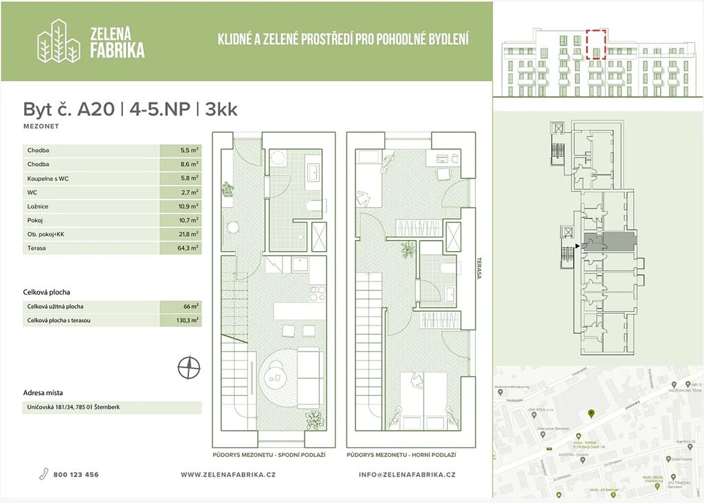 Nabízíme mezonetový byt 3+kk o užitné ploše 66 m² ve 4.–5. nadzemním podlaží (byt A20) s prostornou terasou 64,3 m² v rámci 3. etapy projektu Zelená Fabrika ve Šternberku.
