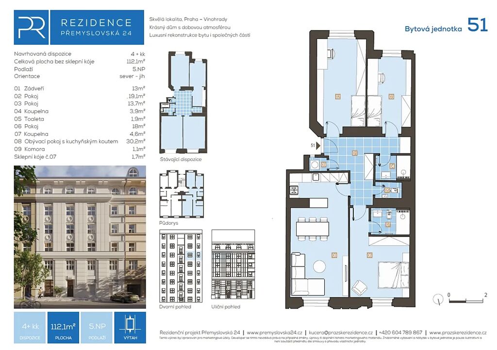 Developer Vám nabízí ke koupi byt č. 51 v projektu "Rezidence Přemyslovská 24". Jedná se o 4+kk po celkové rekonstrukci, nacházející se v 5.NP. Dispozice bytu: vstupní hala, obývací pokoj s kuchyňským koutem, 3 ložnice, 2 koupelny (1 s WC), samostatné WC, komora s místem pro pračku. K bytu náleží sklepní kóje.