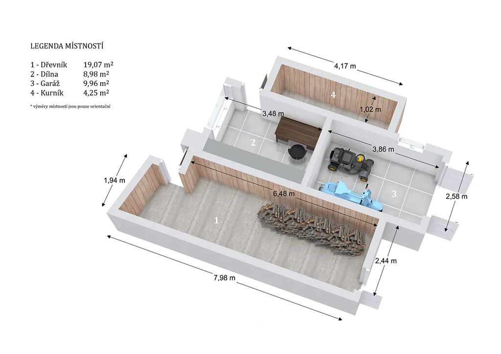 průjezd - 17,32 m², dílna - 13,49 m², dílna - 7,01 m², sklad - 9,04 m², WC - 1,28 m², kotelna - 3,37 m², koupelna - 3,57 m², koupelna - 5,16 m², chodba - 1,82 m², chodba - 15,87 m², chodba - 2,17 m², kuchyň - 8,78 m², spíž - 1,99 m², chodba - 11,03 m², pokoj - 16,39 m², pokoj - 21,10 m², pokoj - 18,33 m², pokoj - 12,08 m², komora - 1,00 m², závětří - 8,75 m², chlév - 3,99 m², chlév - 15 m², chlév - 7,33 m², dřevník - 19,07 m², dílna - 8,98 m², garáž - 9,96 m², kurník - 4,25 m².