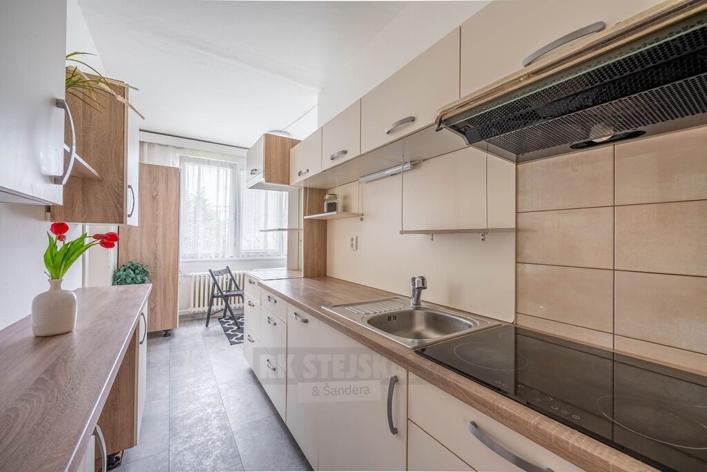 Vybaven je kuchyňskou linkou se sklokeramickou deskou a myčkou. Dále je v bytě lednice a pračka.