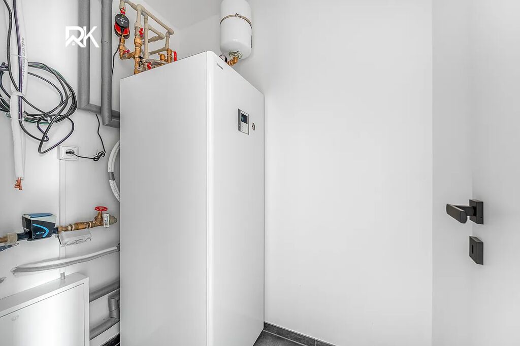 Dům je postaven z kvalitních tvárnic Ytong Lambda 450, které zajišťují výborné tepelně-izolační vlastnosti a nízké provozní náklady. Vytápění a ohřev vody zajišťuje moderní tepelné čerpadlo Toshiba s podlahovým vytápěním v celém objektu, doplněné o přípravu pro klimatizaci a fotovoltaiku. Dům dosahuje energetické třídy B, což garantuje úsporný a komfortní provoz.