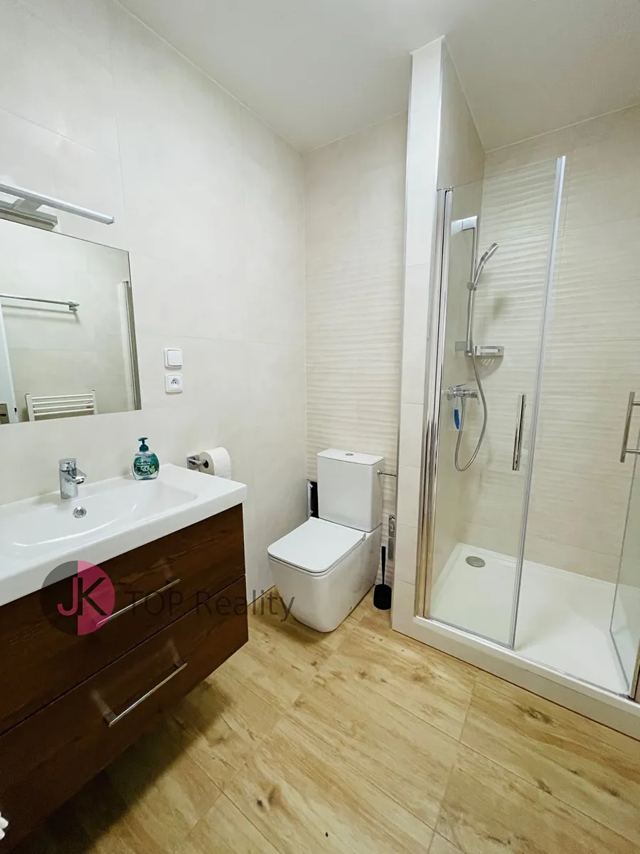 V koupelně se nachází sprchový kout, WC, zrcadlo a úložná skříňka.