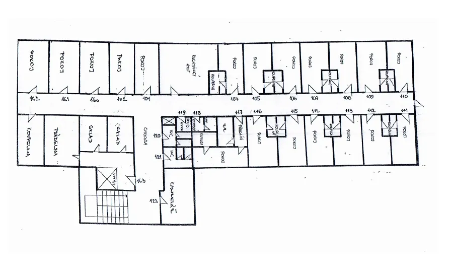 3 podlaží, přičemž každé z podlaží má plochu 700 m². Kolem budovy je zřízeno vlastní parkoviště pro dostatečné množství automobilů. V objektu je nainstalovaný kamerový systém a je zde rovněž ostraha. Máme několik druhů pokojů různých velikostí, různě dispozičně řešeny, s vlastním či společným sociálním zázemím.