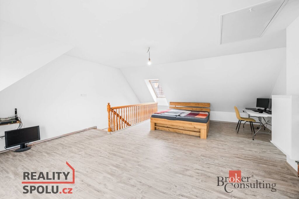 V prvním patře se nachází velký otevřený prostor sloužící jako ložnice, který lze v případě potřeby přepažit a rozdělit na dvě samostatné místnosti. Patro doplňuje druhá koupelna s WC, což zajišťuje komfortní užívání pro vícečlennou rodinu.