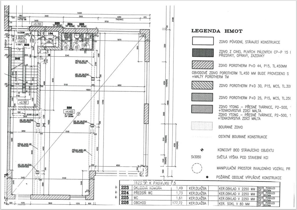 Nabízené prostory jsou situované v 1.poschodí obchodního domu, doposud využívány pro účely provozování obchodu a služeb. Hlavní (komerční) část tvoří prostor o rozloze 177,72m2, zbytek tvoří samostatné wc se zázemím 3,34m2 a technická místnost 1,49m2 (viz půdorys).