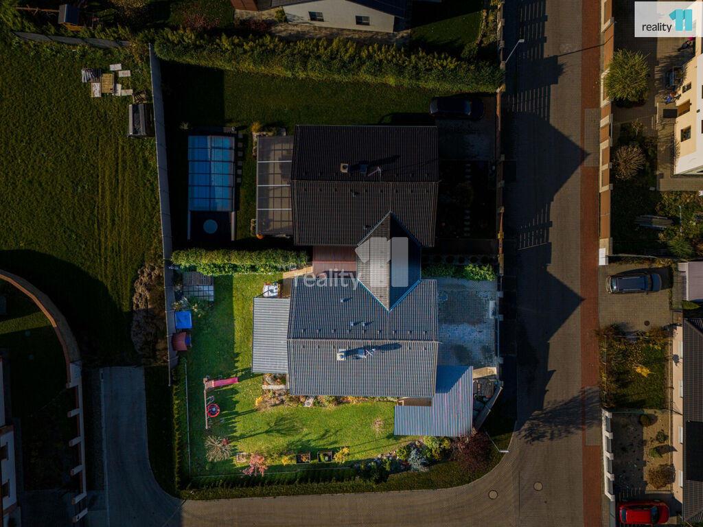 Zahrada je pečlivě udržovaná, s dostatkem prostoru pro odpočinek i dětské hry. Najdete zde zastřešené posezení pod pergolou, zahradní domek i elektricky ovládanou vjezdovou bránu.