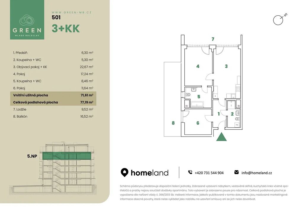 Světlý prostorný byt s lodžií a balkonem o dispozici 3+kk a celkové podlahové ploše 77,19 m² je součástí moderního rezidenčního projektu Green Mladá Boleslav.