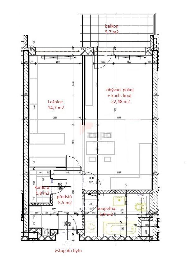 Dispozice bytu: obývací pokoj je propojen s kuchyňským koutem a balkonem, ložnice je samostatná a neprůchozí, v koupelně je vana a WC + prostor pro pračku.