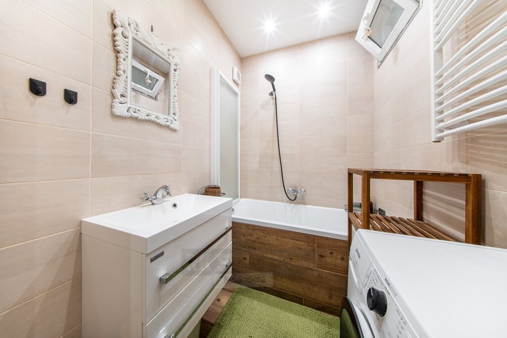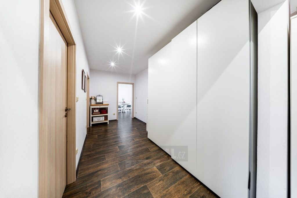 Dispozice bytu: Předsíň, po levé straně se nachází samostatná toaleta, koupelna vybavena umyvadlem, vanou se zástěnou a pračkou. Předsíň se napojuje na halu, ze