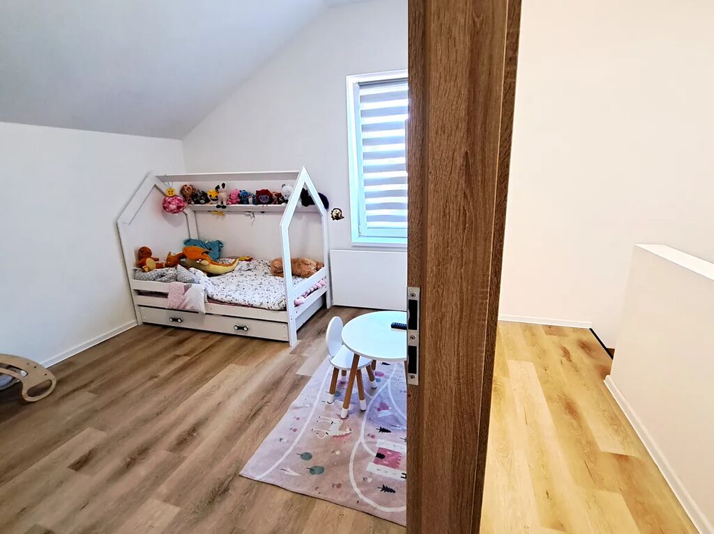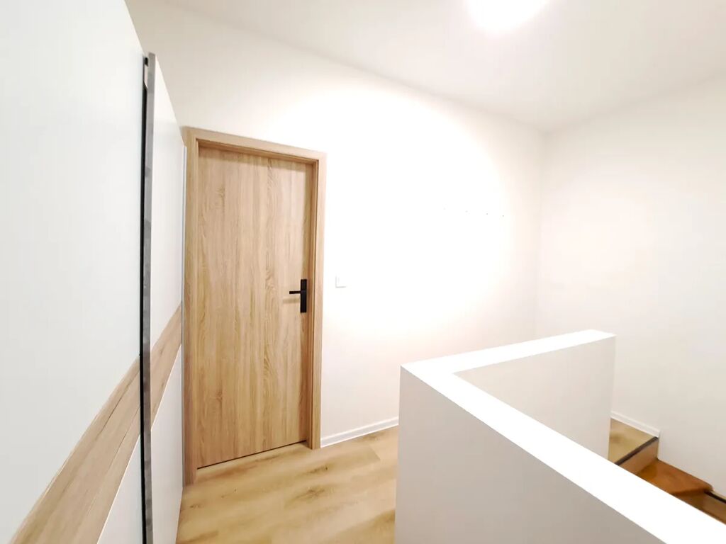 Přízemí - vstupní chodba, koupelna (umyvadlo, sprchový kout, WC), samostatná komora pro pračku, sušičku a el. bojler na ohřev vody, kuchyň se zabudovanou myčkou, která je propojená s obývacím pokojem, dále příjemné nové bukové schody do 1.NP - kde jsou dva samostatné vstupy do ložnice a dětského pokoje, chodba s šatní skříní.