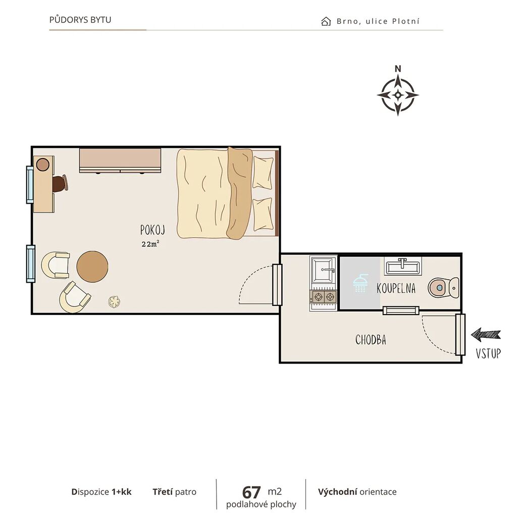 Plocha bytu 32 m² nabízí jeden větší pokoj orientovaný na východ (vstávání se sluncem zaručeno). V předsíni je prostor na botník a menší úložné prostory.