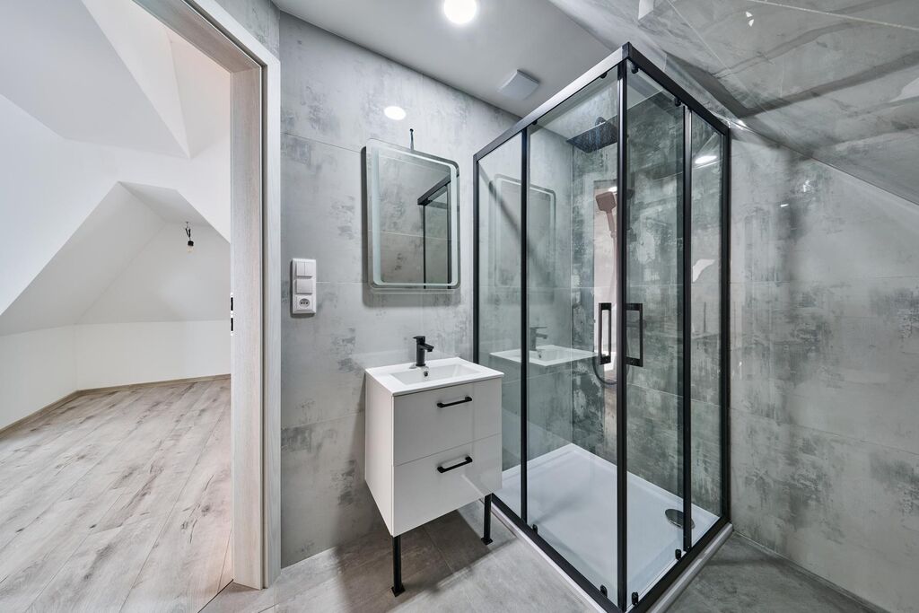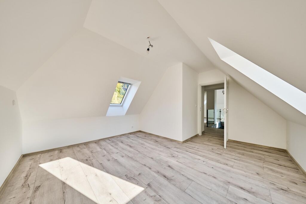 Dispozice bytu: předsíň, kuchyně, obývací pokoj, koupelna s vanou i sprchovým koutem a WC, schodiště do patra, koupelna se sprchovým koutem a WC, 2x pokoj.