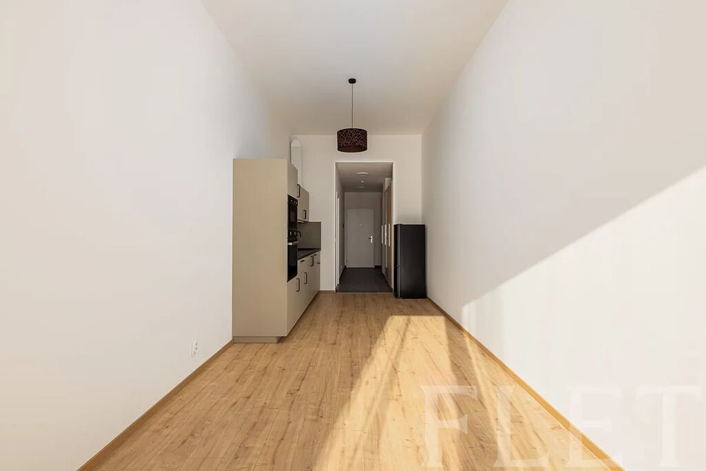 Obývací prostor s kuchyňským koutem je díky velkým oknům příjemně světlý a propojený s venkovním prostorem. Kuchyň je plně vybavená, nechybí vestavná pračka ani myčka. V chodbě je k dispozici velká šatní skříň, koupelna je vybavena sprchovým koutem a toaletou.