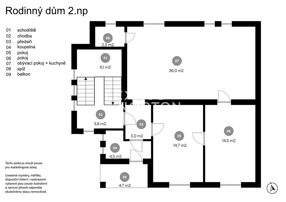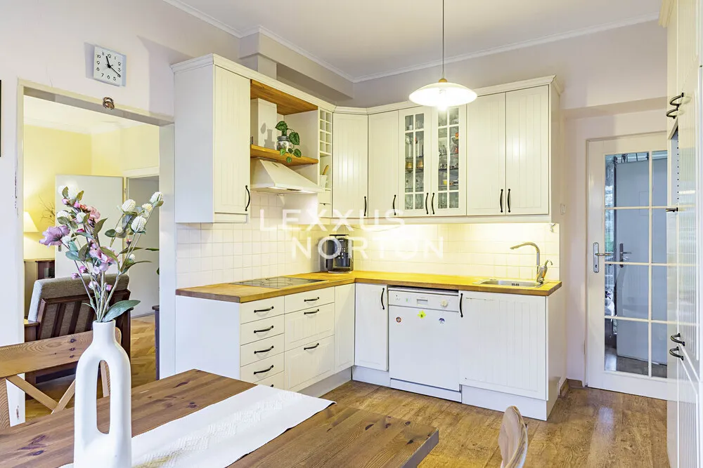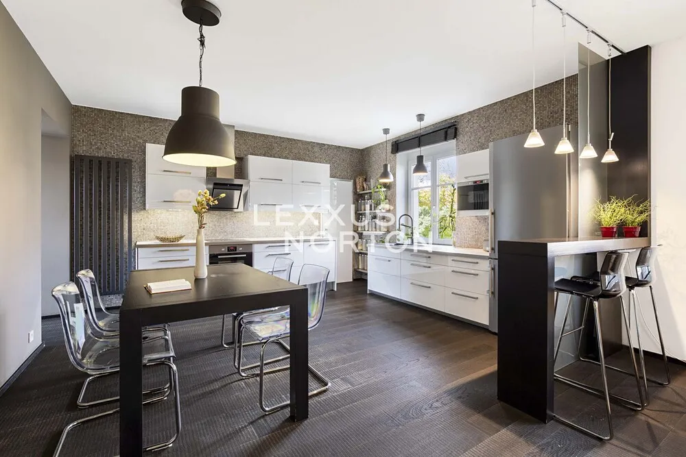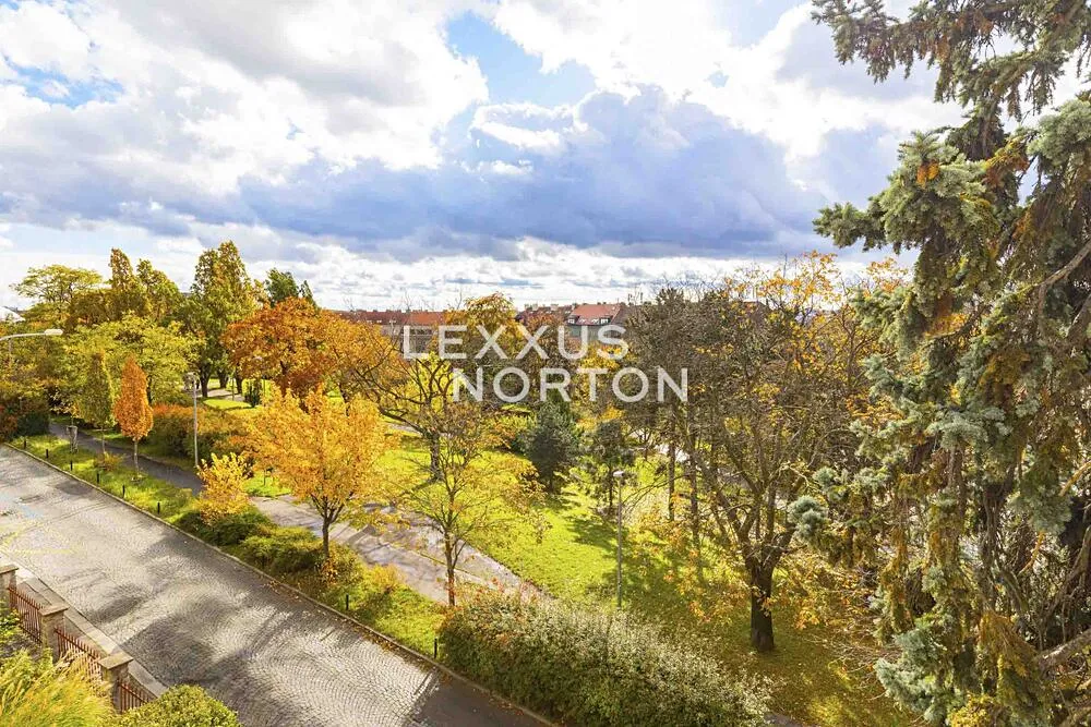Ve druhém podlaží se nachází byt po kompletní rekonstrukci. Otevřený obývací prostor s moderní vybavenou kuchyní a jídelnou je orientován také do zahrady, zatímco dvě ložnice a koupelna nabízejí výhled do parku.