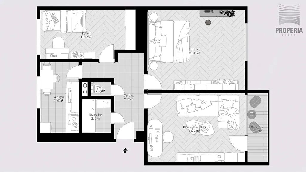 Celková výměra bytu činí 76 m² a díky praktické dispozici i poloze nabízí komfortní bydlení s výbornou dostupností města Plzně: