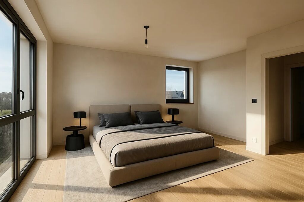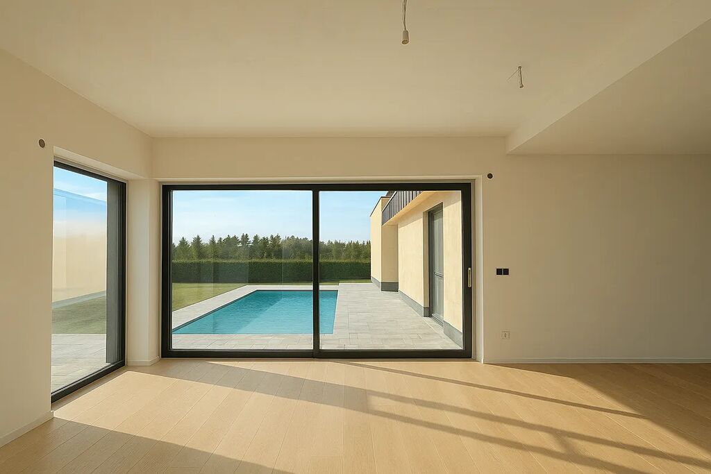 Interiér domu je laděn do světlých, elegantních tónů a navržen tak, aby působil vzdušně a útulně. Okna jsou hliníková v odstínu antracit s trojskly a přípravou na vnější elektrické žaluzie, vchodové dveře jsou taktéž hliníkové v antracitové barvě. Interiérové dveře jsou bezfalcové se skrytými panty a magnetickým zámkem, což podtrhuje moderní a čistý design interiéru. V celém domě jsou použity kvalitní materiály – dlažba a dřevěná podlaha DUB Harmony, které dodávají prostoru přirozenou eleganci. Dům je vybaven podlahovým vytápěním s možností individuální regulace teploty v jednotlivých místnostech pomocí termostatů. Koupelny jsou zařízeny designovými prvky značek Laufen, Hansgrohe a Zehnder a doplněny o stylová zrcadla a úložné skříňky pod umyvadla.