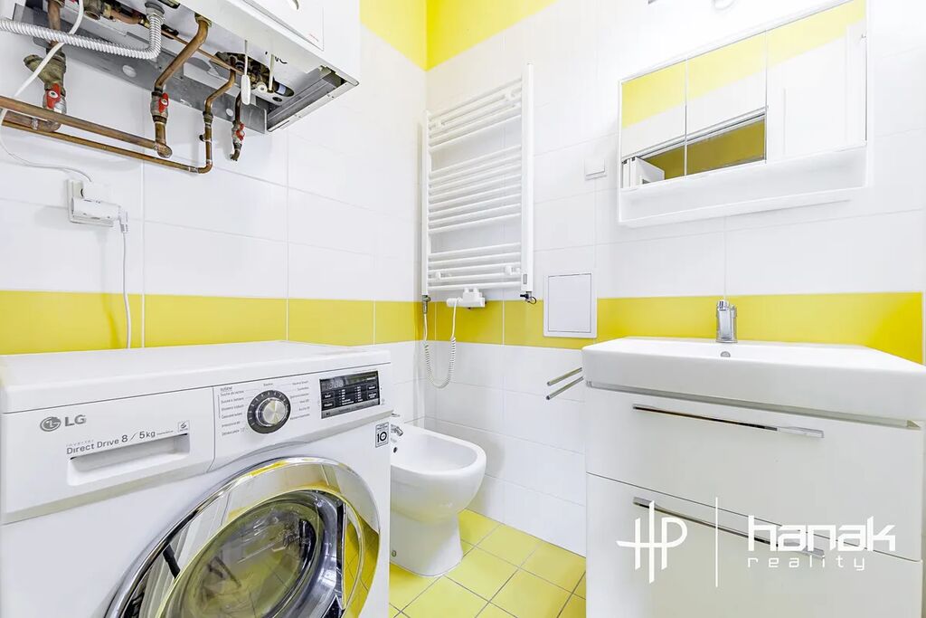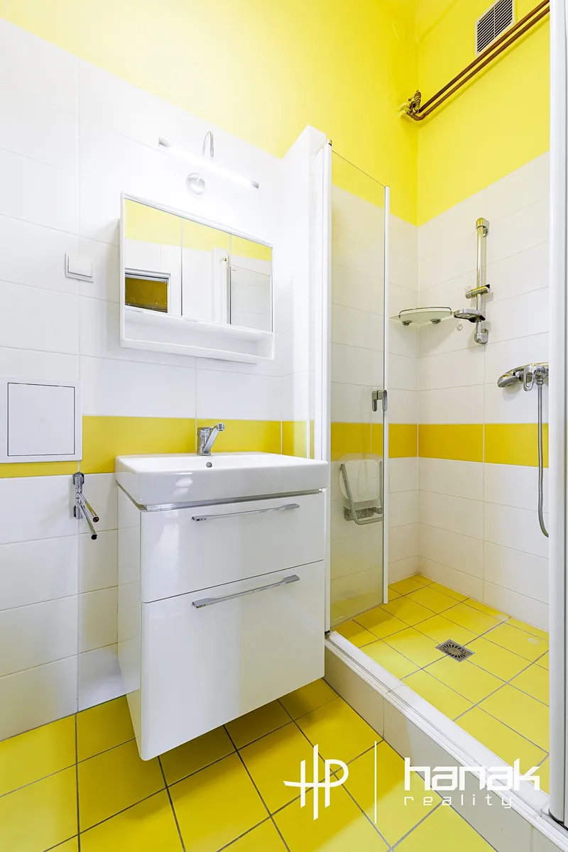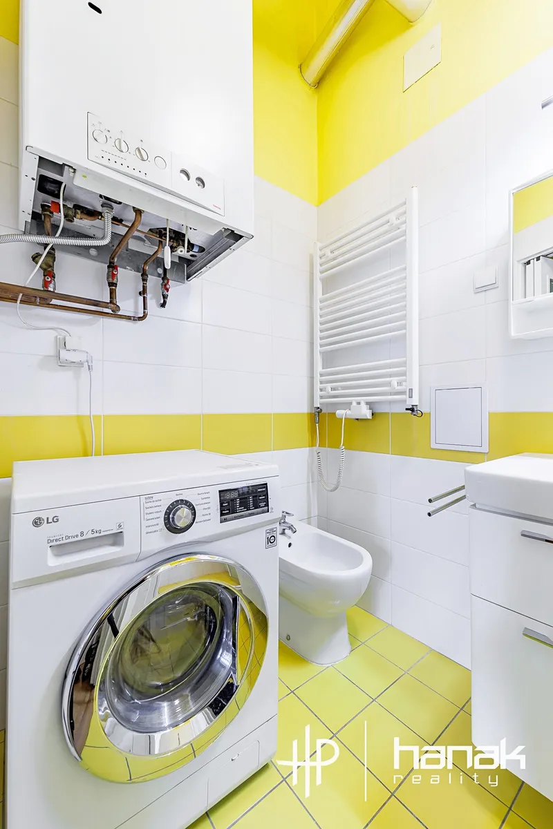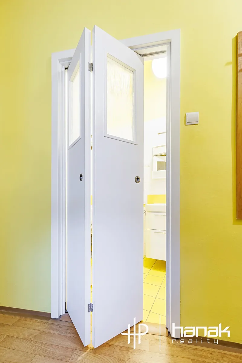Dispozice bytu nabízí velkou vstupní chodbu s úložným prostorem, praktickou spíž, kterou je možné využít jako šatnu, oddělenou toaletu s umyvadlem a oknem do světlíku, koupelnu se sprchovým koutem, umyvadlem, výlevkou a místem pro pračku. Dále se zde nachází kuchyně se spotřebiči a místem pro jídelní stůl.