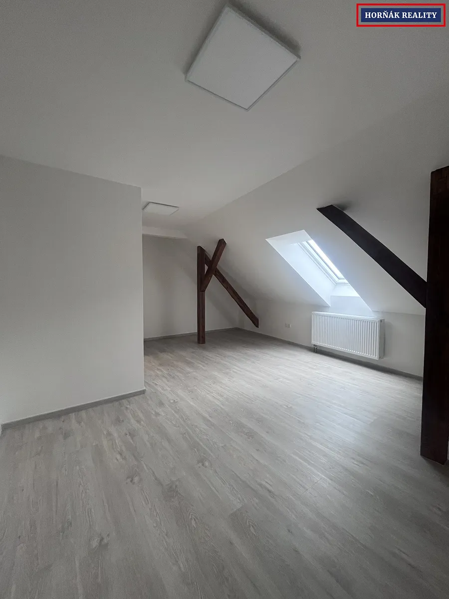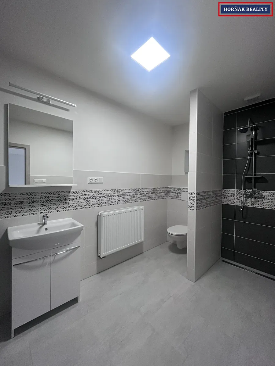 V patře jsou umístěny dva samostatné pokoje a druhá koupelna s WC.