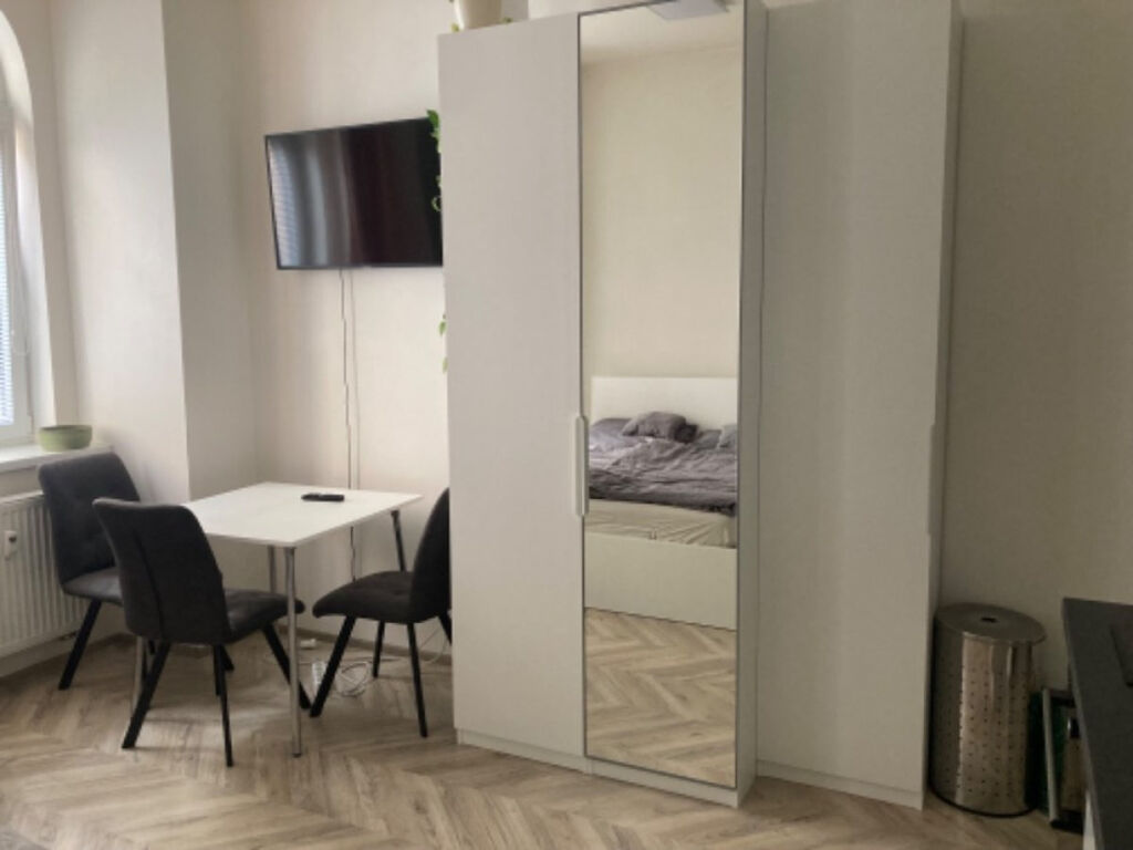 Byt se nabízí plně vybavený. Kuchyně disponuje lednicí, myčkou, elektrickou troubou, varnou deskou a digestoří. Místnost je zařízena postelí, konferenčním stolem, židlemi, televizí a knihovnou. V koupelně je sprchový kout, umyvadlo a toaleta.