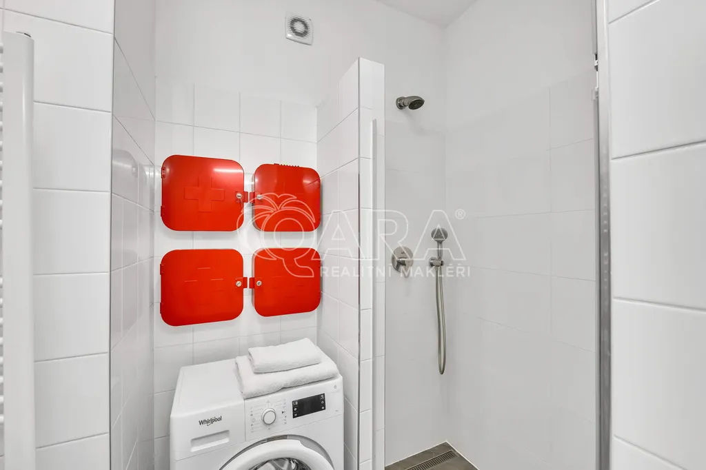 Jednotka je částečně vybavena a má dostatek úložných prostor. V kuchyni můžete využívat všechny nezbytné spotřebiče jako lednice s mrazákem, myčka, el. dvouvařič, digestoř, pečící trouba. Ložnice je vybavena prostornou šatní skříní a obývací pokoj sedačkou, TV a konferenčním stolkem. Koupelna se sprchovým koutem má k dispozici pračku. WC je samostatné.
