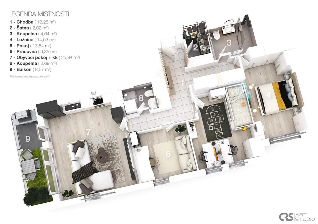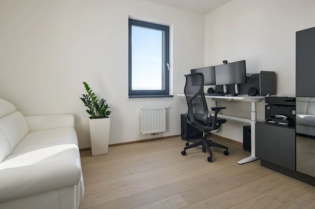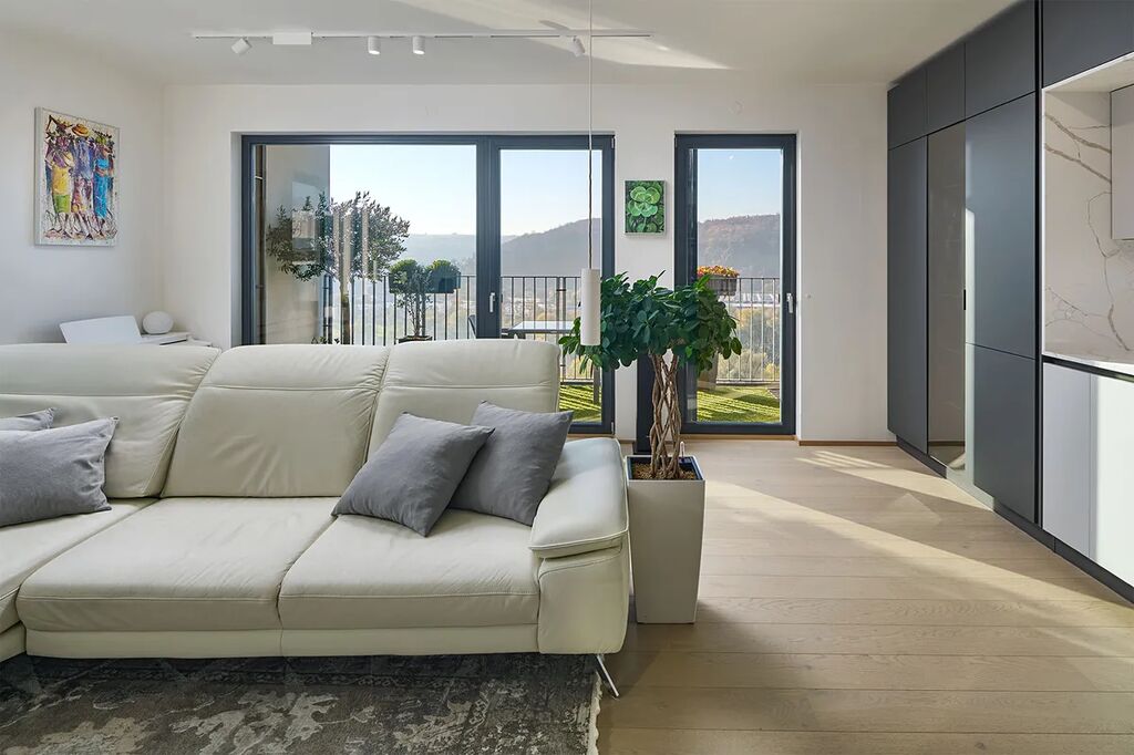 Velkoformátová dlažba, sanita prémiové úrovně, kompletní osvětlení Philips Hue, klimatizace ve všech místnostech, 3M solární fólie, dálkově ovládané žaluzie, sítě proti hmyzu, kamerový rozvod v bytě i na lodžii.