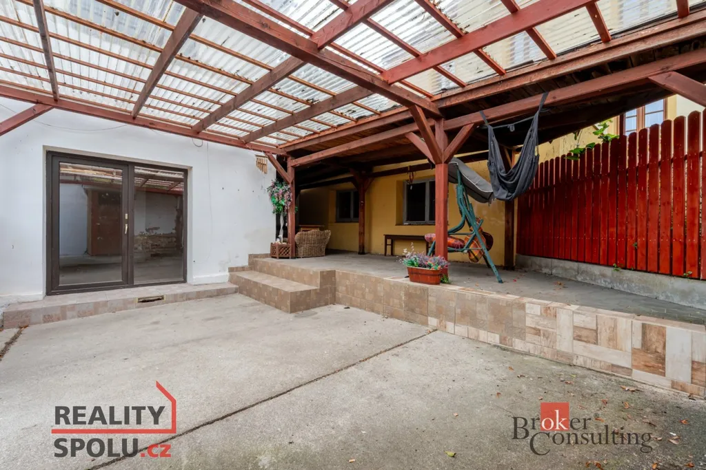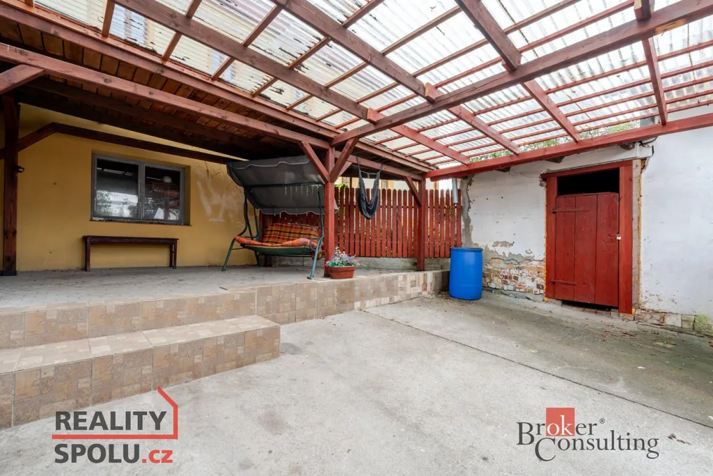 Na pozemku se nacházejí tři pergoly – dvě novější pro hosty, jedna původní u domu. V letních měsících zde bývalo oblíbené venkovní posezení. Součástí jsou také garáže s vysokými stropy, které lze přestavět na technické zázemí, úschovnu kol nebo další prostory pro hosty.