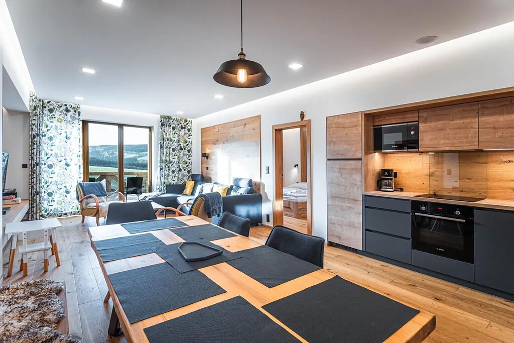 Centrem apartmánu je obývací pokoj s řemeslně kvalitně zpracovaná kuchyňí na míru (varná deska, trouba, mikrovlnná trouba, lednice, rychlovarná konvice, překapávač, toustovač, myčka, kompletní nádobí), velkým jídelním stolem a balkónem s těmi nejkrásnějšími výhledy. Celý byt včetně terasy je orientovaný primárně na západ a krásně prosluněný po celý den. Celý prostor je vyhříván komfortním podlahovým topením, které zaručuje příjemnou teplotu během celého roku. Po každé straně obývacího pokoje se nachází jedna velkorysá ložnice s plným soukromým včetně vlastní koupelny s WC.