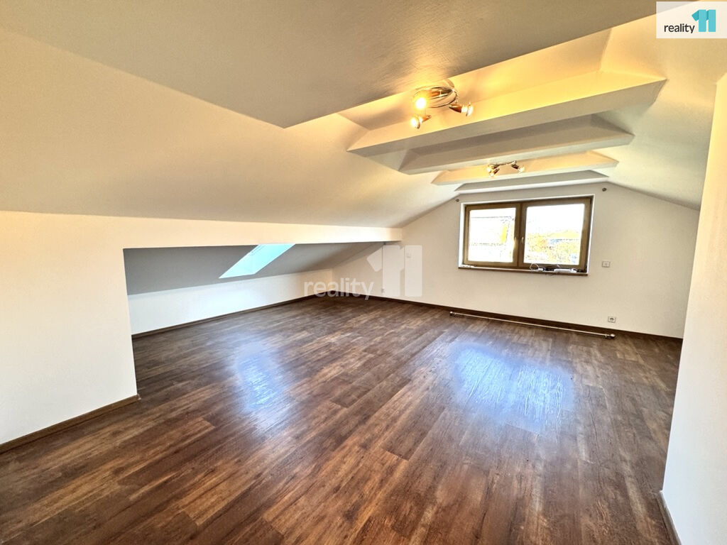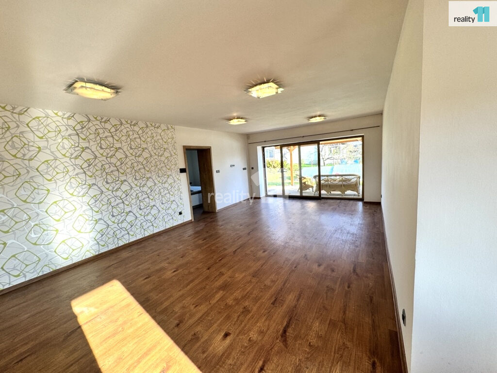 Nabízíme Vám k pronájmu moderní, slunný dvoupodlažní dům 4+kk, umístěný do velké zahrady s bazénem, s příjemným výhledem do okolí. Dům je dispozičně velmi dobře vyřešen, má dva vstupy - buď klasickým zádveřím do chodby, ze které je přístupná spodní koupelna se sprchovým koutem, toaleta, vedou odtud schody do patra. Z chodby je pak přístupný obývací pokoj. Druhý vstup je přes terasu, kdy vstoupíte přímo do srdce domu - prostorného, slunného, obývacího pokoje. Ten je částečně spojený s kuchyňským koutem, kde najdete opravdu dostatek úložných prostor jak na kuchyňské vybavení, tak na potraviny, neboť k němu přiléhá i spíž. Kuchyně je opravdu velkorysá, s velkým oknem. Z obývacího pokoje je přístupná také spodní ložnice, ke které patří navíc prostorná šatna. Dále je zde i technické místnost s tepelným čerpadlem, do které se ale vejde i spousta dalších věcí, jako třeba lyže, či nářadí pro kutily.
