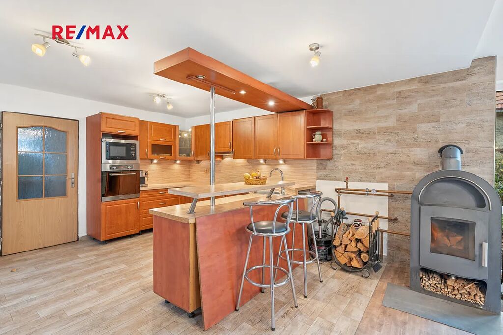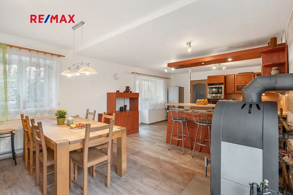 V přízemí se nachází prostorný obývací pokoj s kuchyní o rozloze cca 50 m², z něhož vedou dvoje francouzská okna na velkou i malou zahradu. Dominantou prostoru jsou krbová kamna s výměníkem, která jsou napojená na radiátory v celém domě a společně s plynovým kotlem zajišťují efektivní a úsporné vytápění. Dále je zde chodba, koupelna se sprchovým koutem a WC, úložný prostor pod schody a další samostatná místnost, kterou lze využít například jako pokoj pro hosty či pracovnu.