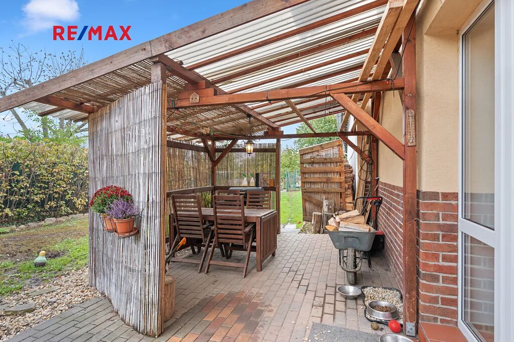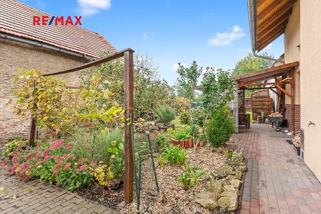 Na pozemku o velikosti 479 m² se rozkládá udržovaná zahrada s pergolou, ideální pro letní posezení, grilování nebo hraní dětí. Před domem je vydlážděný dvorek s parkovacím místem.