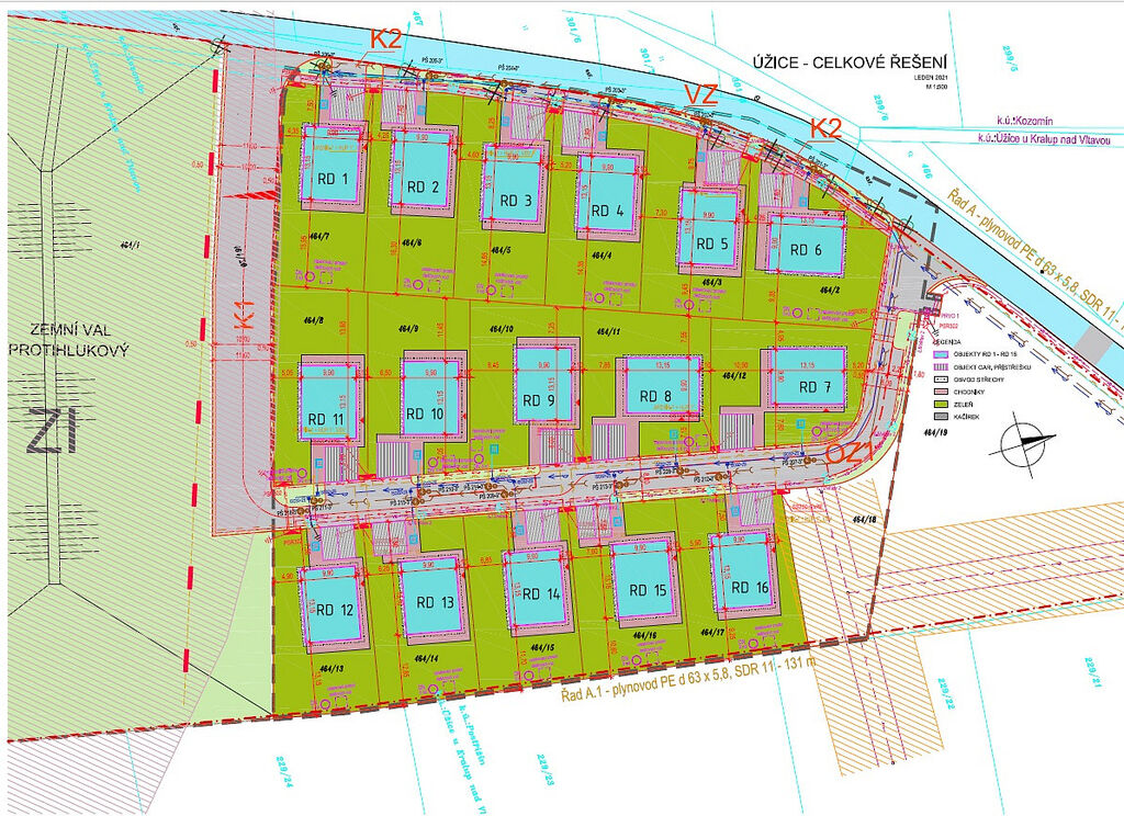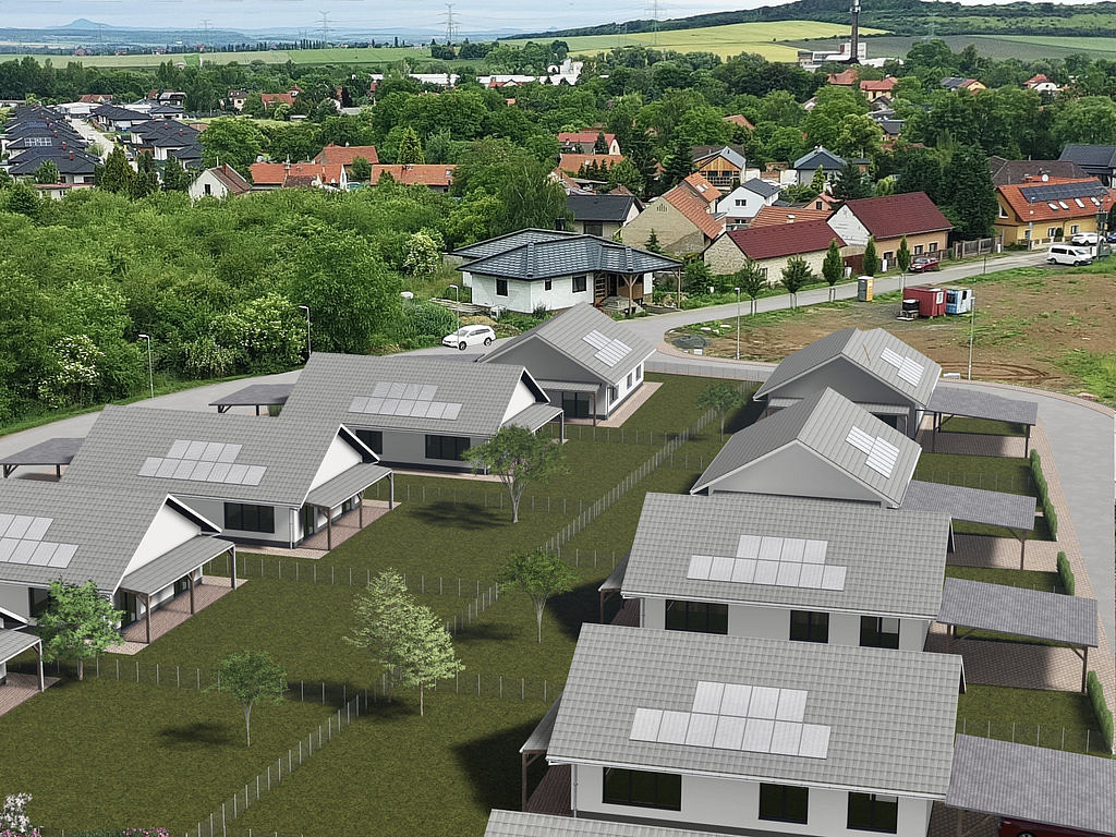 Jedná se o pozemky p.č. 464/14, 464/15, 464/16 a 464/17, k.ú. Úžice u Kralup nad Vltavou. Jednotlivé stavební pozemky jsou o rozloze cca 600m². Navržené domy jsou samostatně stojící přízemní domy se sedlovou střechou. Dispozičně se jedná a RD 4KK s terasou a carportem. Zastavěná plocha domu je 130 m² (viz. půdorys 1. NP), podkroví lze realizovat celé délce domu pochozí v šířce minimálně 2,5m s výškou 1,7m.