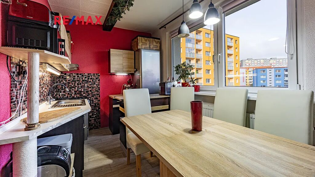 Kuchyně je prakticky řešená a proto, je zde dostatek prostoru pro vaření i stolování. Byt je nejen esteticky pěkný, ale i bezpečný – jsou zde instalovány bezpečnostní vstupní dveře, které zvyšují komfort i ochranu domácnosti.
