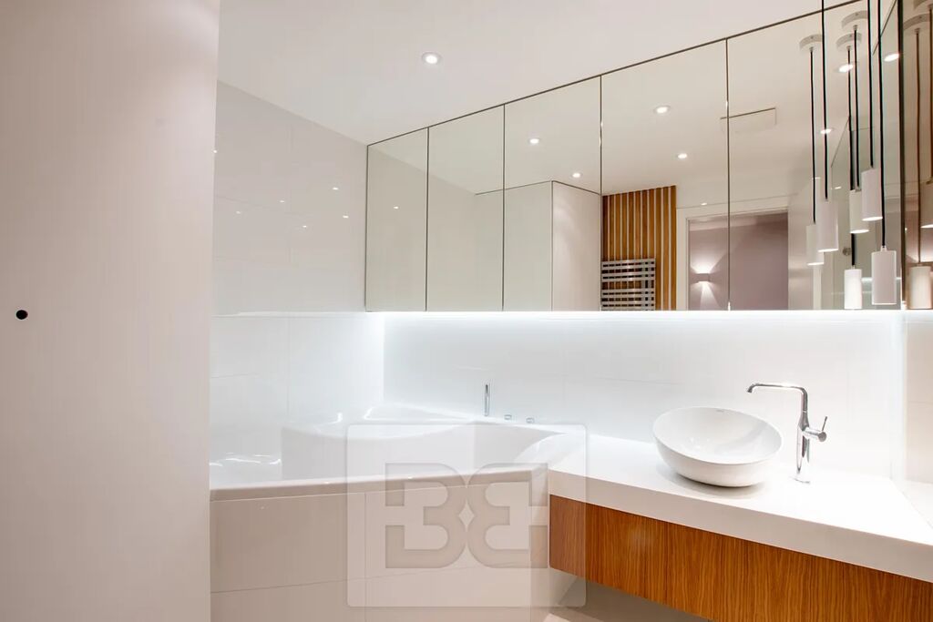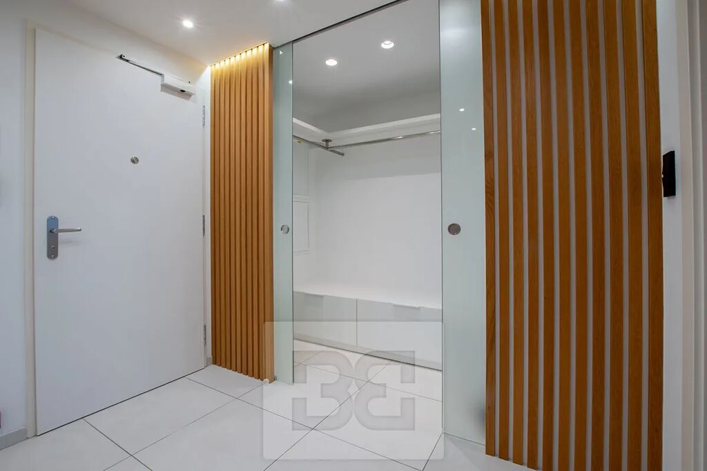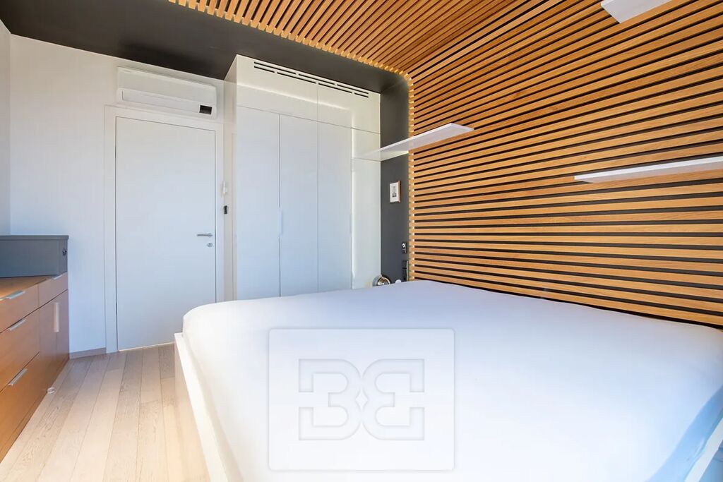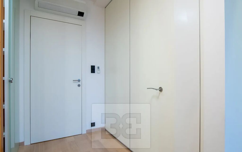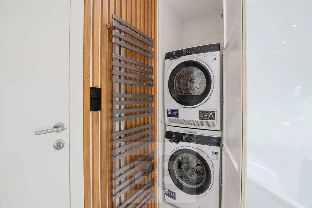 Interiér bytu je světlý, vzdušný a designově propracovaný. V celém bytě jsou dřevěné lakované podlahy a velkoformátová hliníková okna, která do prostoru přivádějí dostatek denního světla. Byt je kompletně vybaven tak, jak je k vidění na fotografiích.