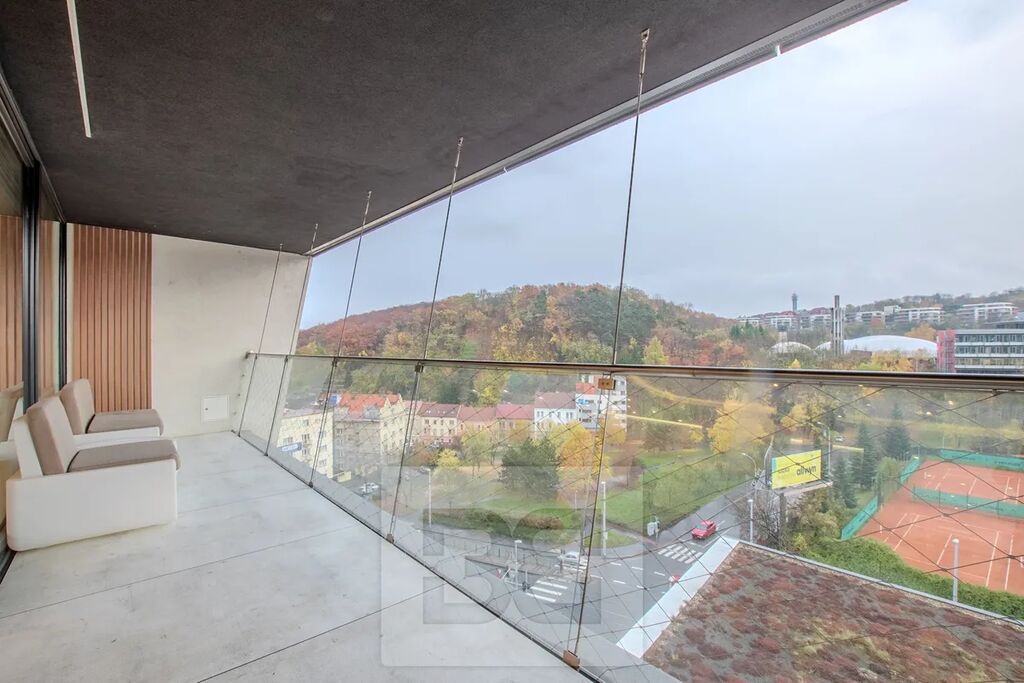 Součástí pronájmu je prostorný balkón o velikosti 15 m², velký sklep a dvě garážová stání, která jsou již zahrnuta v ceně.