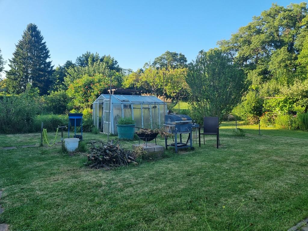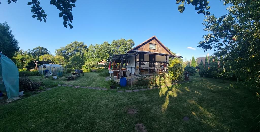 Chata stojí na vlastním pozemku. Zahrada o výměře 406 m2 je v pronájmu od města.