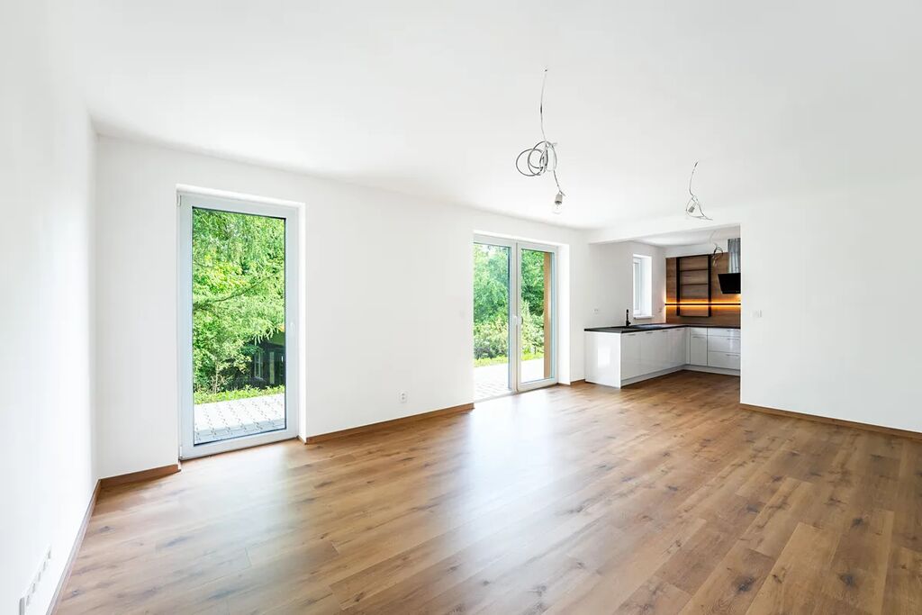 Podlahy pokryté kvalitním vinylem a dlažbou, okna s trojskly pro skvělou tepelnou a zvukovou izolaci.