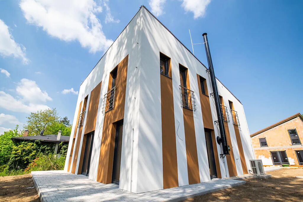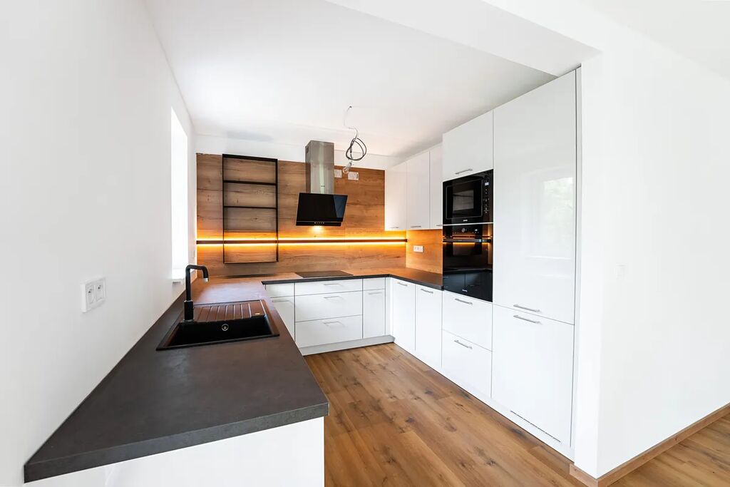 Prostorný obývací pokoj s velkou moderní kuchyňskou linkou a přímým vstupem na terasu, která obklopuje téměř celý dům. Prezentujeme kuchyni z domu C a dům C, který je již pronajatý. Aktuální dům B a kuchyně bude inzerována po její instalaci začátkem prosince 2025. Domy jsou postavené ve stejném standardu.