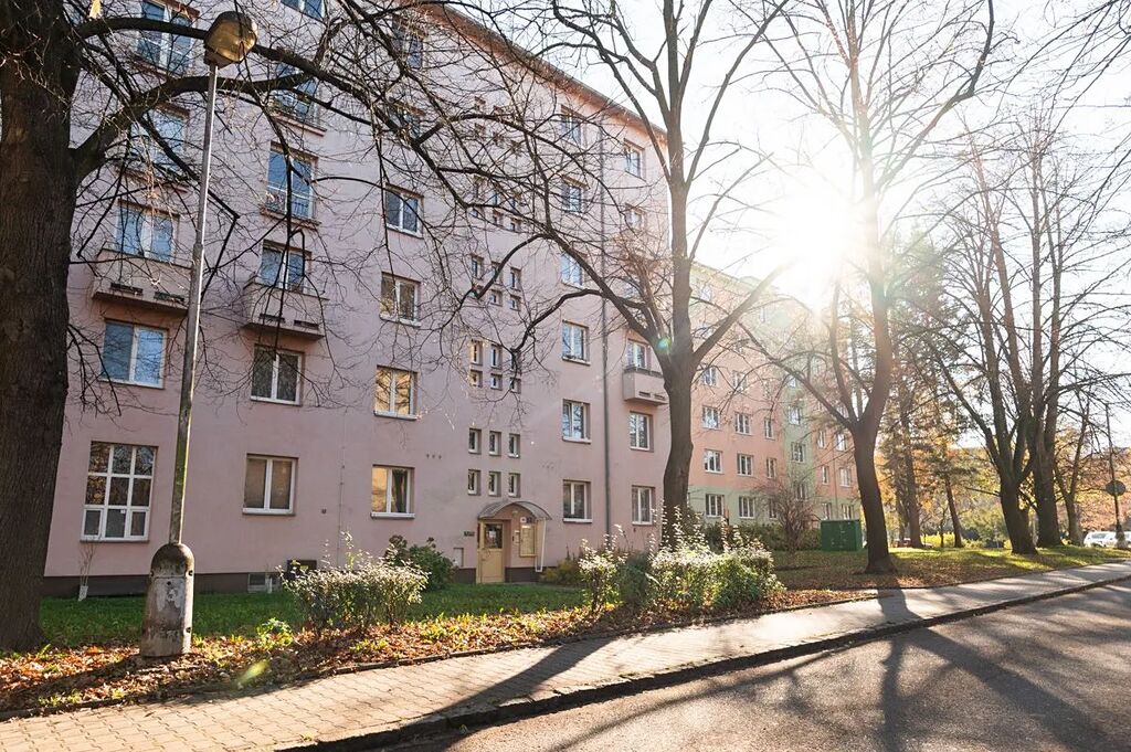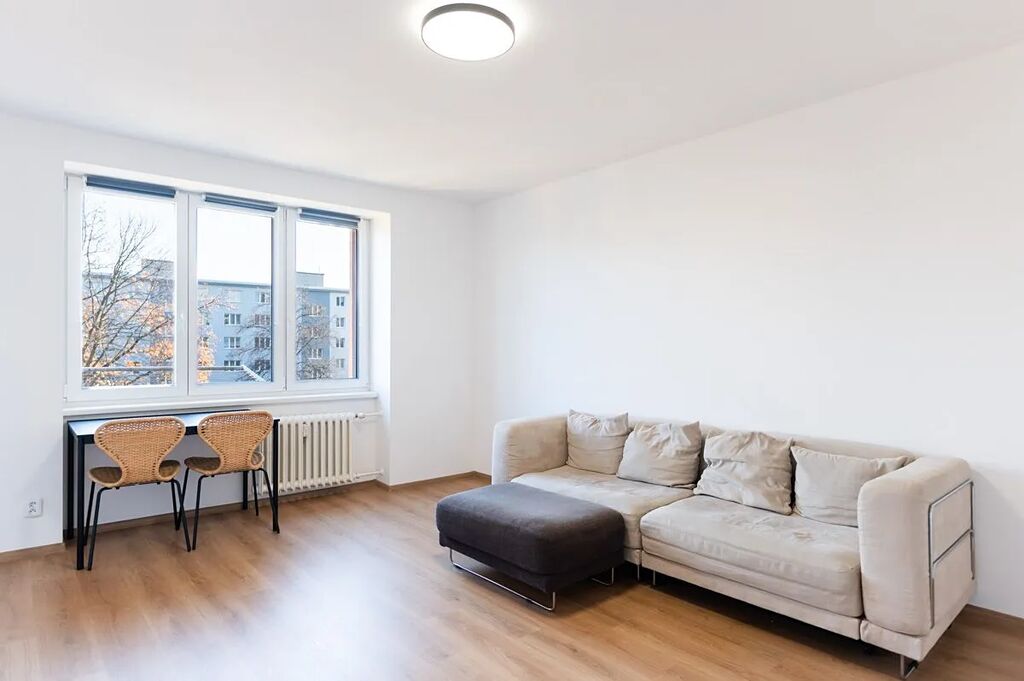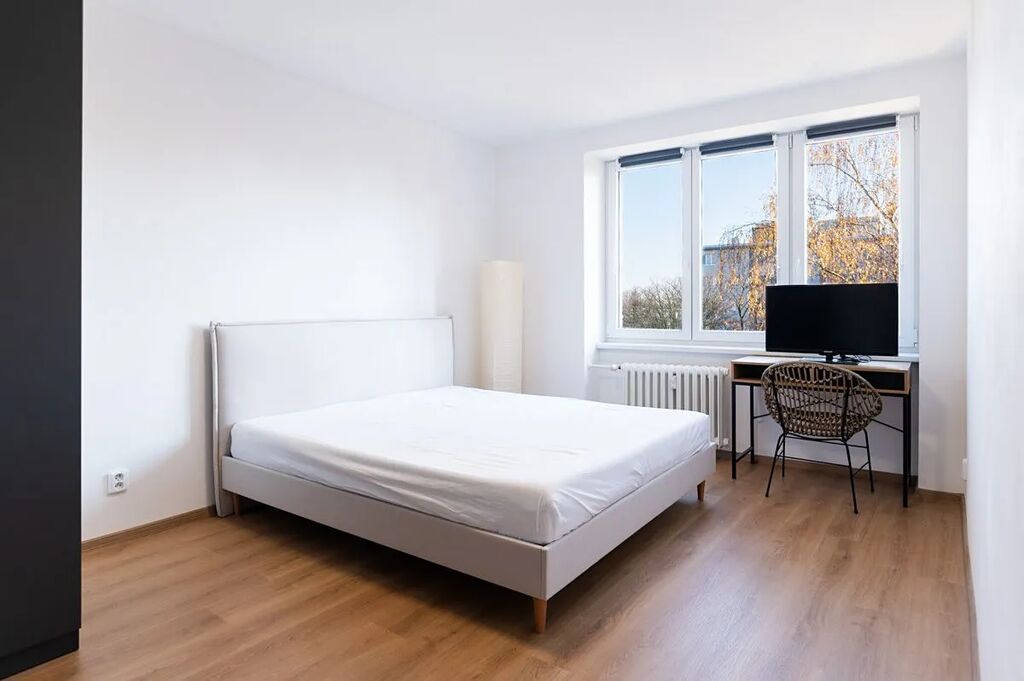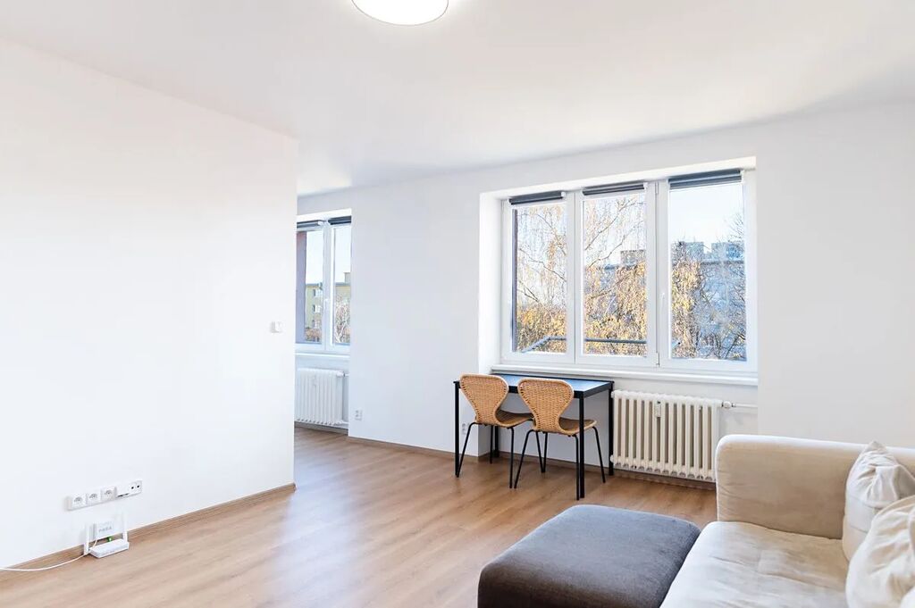 Byt je velmi slunný s výhledem do zeleně a klidné části do dvora, je částečně vybaven (sedací souprava, jídelní stůl se židlemi, postel, pračka se sušičkou aj.)