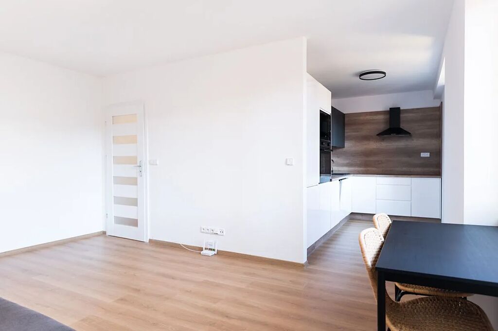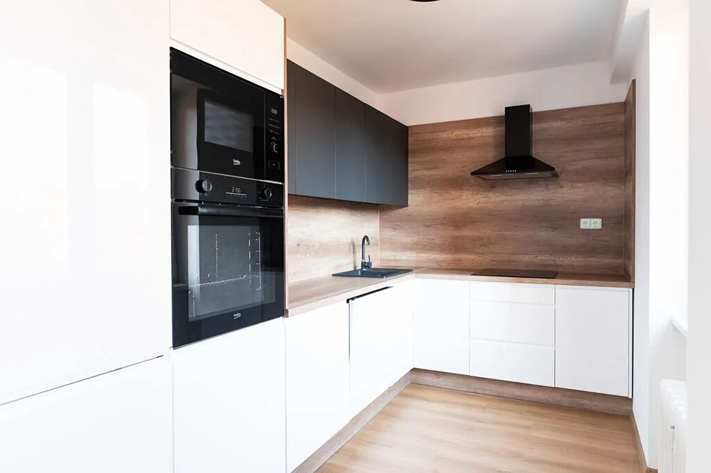 Byt je po celkové rekonstrukci nová zvětšená koupelna, rohová kuchyňská linka s vestavěnými spotřebiči, plovoucí podlahy, nové omítky, dveře, elektroinstalace v mědi.