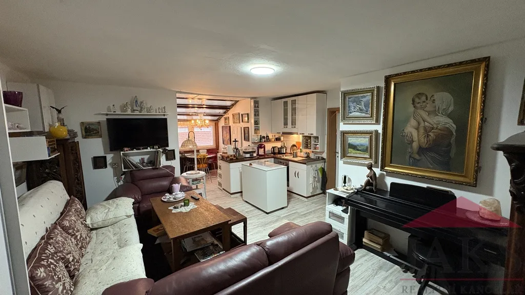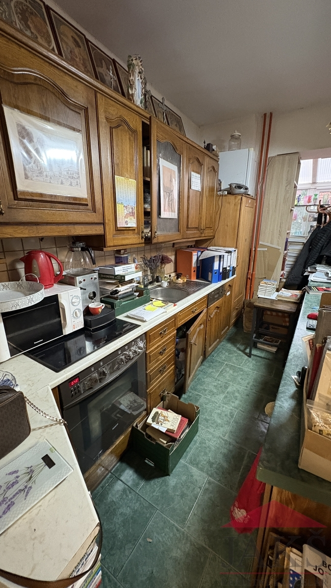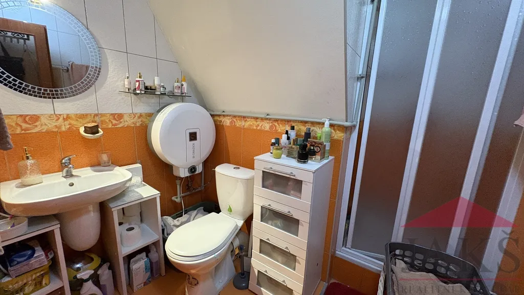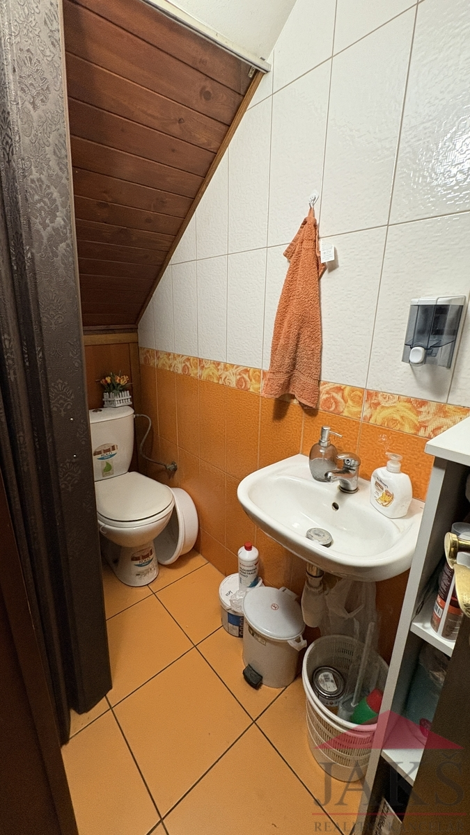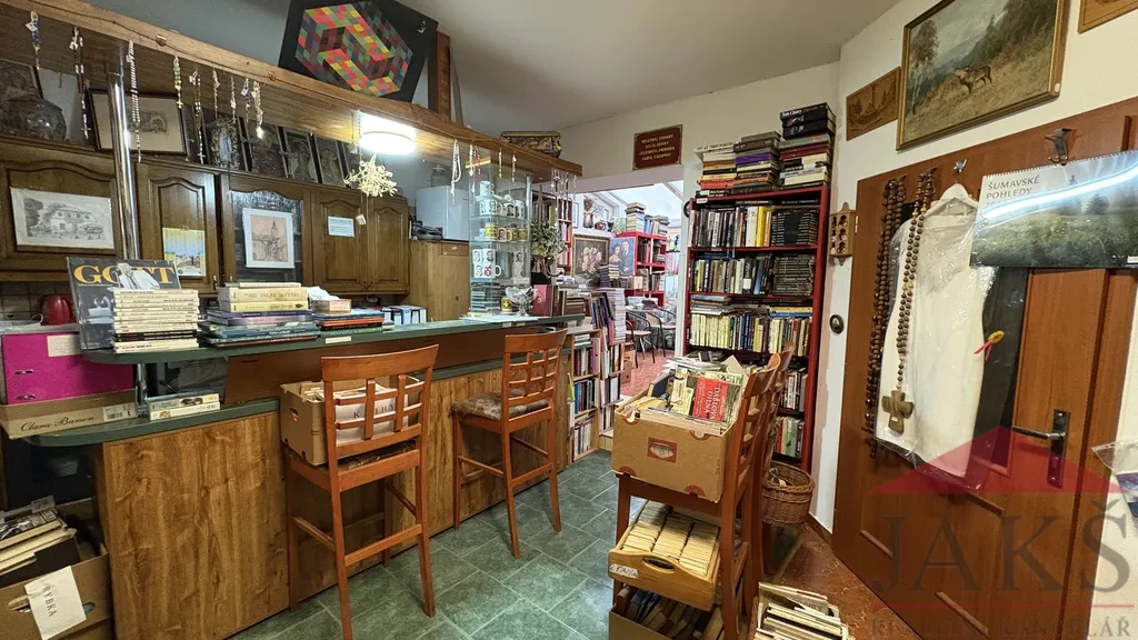 Popis: suterén (cca 60 m2): část. podsklepeno: chodba, potravinový sklep, kotelna (plynový kotel, moderní kotel na dřevo, el. boiler a vývody na pračku), koupelna (rohová vana, sprchový kout, umyvadlo se zrcadlem a skříňkou, topný žebřík a 2x WC), dvou-garáž s el. vraty; přízemí (85,9 m2): obchod: 2x prodejní místnost, chodba, schodiště (do sklepa a do podkroví), sam. WC s umyv., původní obytná kuchyň (kuch. linka s barem a vestavěnými spotřebiči: HV trouba, sklo.ker. deska, digestoř, myčka) s jídelnou, prosklený obývací pokoj (nyní vše užíváno jako prodejna) se vstupem na terasu (posezení); podkroví (49 m2): byt 3+kk: obývací pokoj s kuch. koutem (rohová kuch. linka s HV troubou a dvou-vařičem (sklo-ker.) a digestoří) se spíží, koupelna (umyv. se zrcadlem, sprchový kout, WC, průtokový ohřívač), 2x podkrovní ložnice, šatna a půdička (sklad).