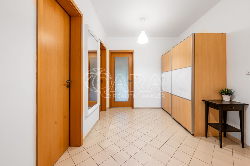 Byt je pronajímán částečně s vybavením. Plně vybavená kuchyňská linka (varná deska, el. trouba, digestoř, lednice, mrazák, myčka, mikrovlnná trouba, vinotéka), pracovní pult/ostrůvek, jídelní stůl s židlemi, sedačka, v ložnici vestavěná skříň. V koupelně s vanou je k dispozici pračka, toaleta, bidet. Dostatek úložných prostor, v chodbě šatní skříň, komora s policemi. V pokojích plovoucí podlahy, v koupelně a chodbě dlažba.