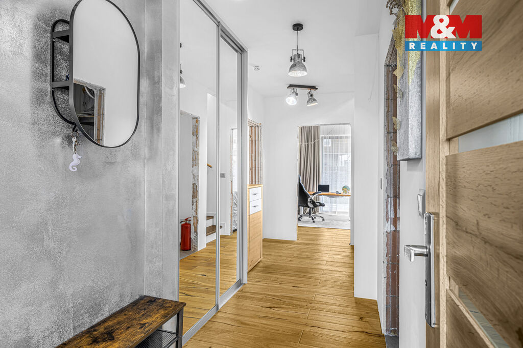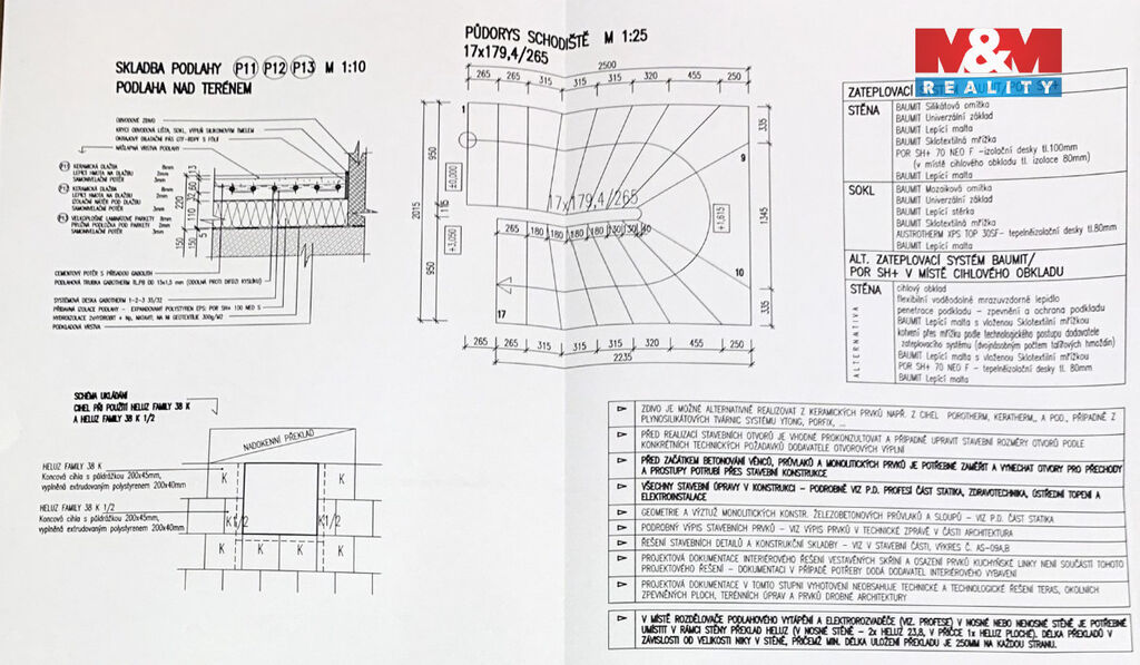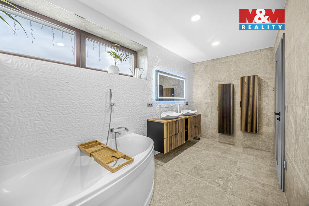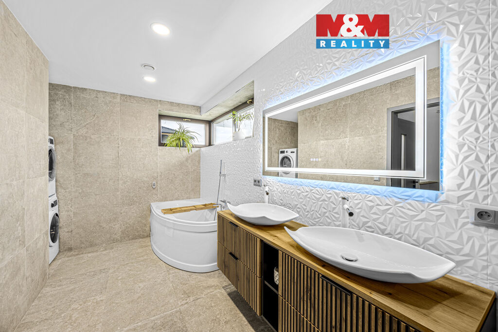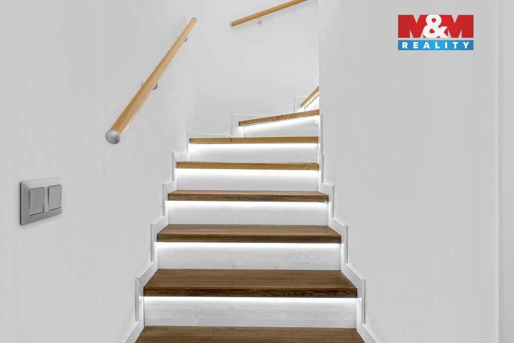 Dispozice: prosvětlený obývací pokoj s jídelnou a kuchyní (příprava na ostrůvek), pracovna, koupelna a technická místnost. V patře tři ložnice, šatna a koupelna s vanou. Zaujmou i moderní designové omítky a nevšední, velmi vkusně řešené interiéry koupelen.