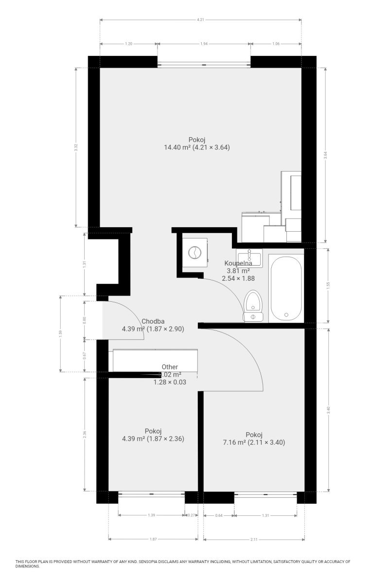 Byt se nabízí vybavený dle fotografií. Předsíň je vybavena skříní a botníkem. Koupelna disponuje vanou, umyvadlem, zrcadlem, pračkou a toaletou.