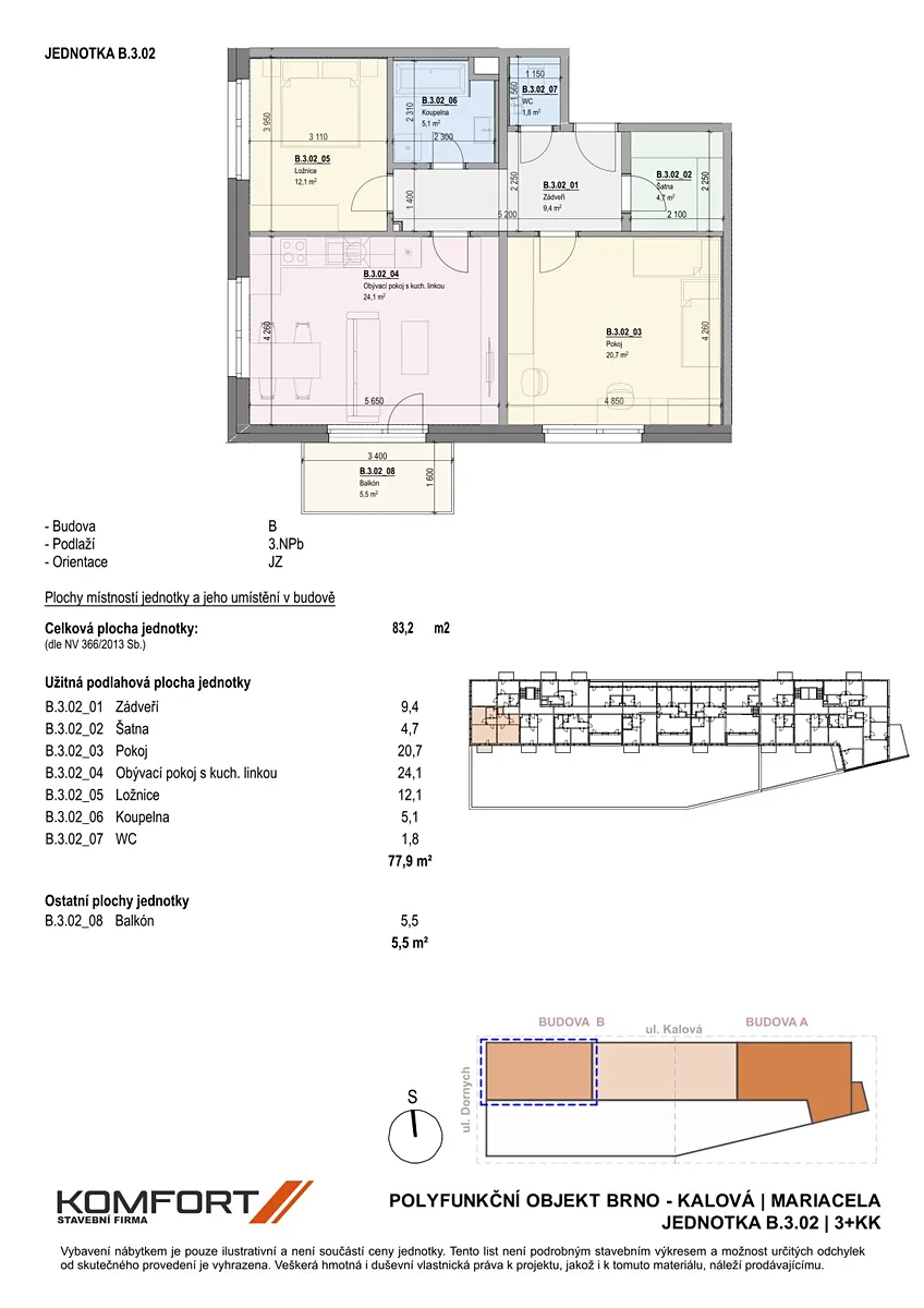 Celkem 94 exkluzivních jednotek různých dispozic s balkonem, lodžií či terasou, umístěných v 1.až 9.nadzemním podlaží. Horní patra umožňují krásný výhled na brněnské dominanty.