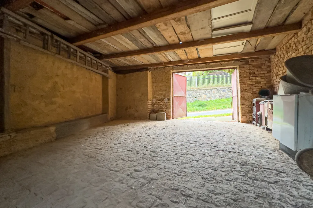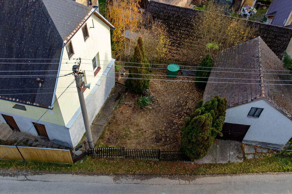 Dům je částečně podsklepen a nabízí dva sklepy o výměrách 8,7 m² a 11,4 m². Pozemek o rozloze 313 m² zahrnuje také garáž se zajímavou kamennou dlažbou a pergolu orientovanou na jih s výhledem do údolí.