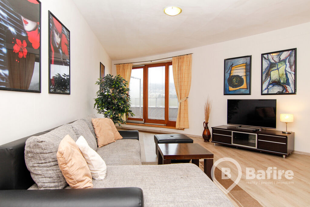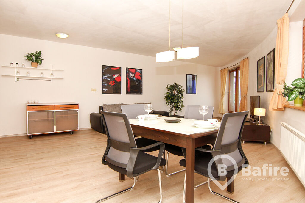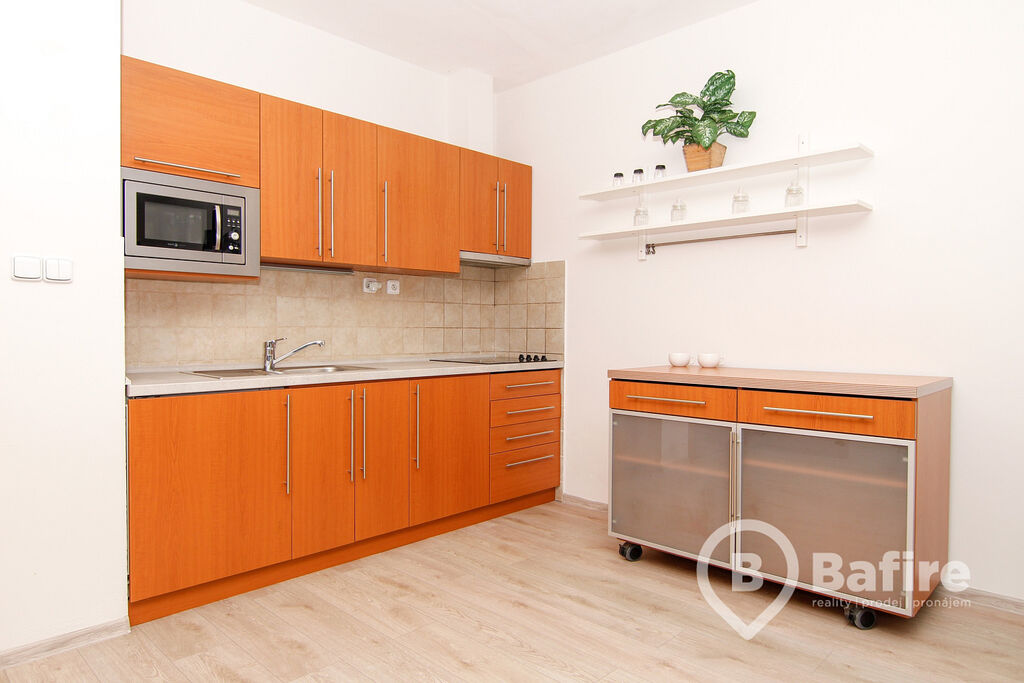 Byt je pronajímán zařízený, tak jak lze vidět na fotografiích. Kuchyňská linka disponuje elektrickou varnou deskou, digestoří, vestavnou mikrovlnnou troubou a menší vestavnou lednicí. Obývací pokoj je poté tvořen z prostorné jídelní části a místem pro sedací soupravu.