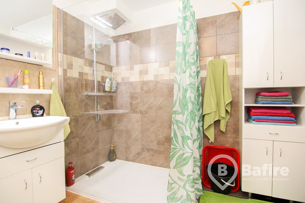 Koupelna poté disponuje nadstandardním sprchovým koutem a velkým množstvím úložného prostoru.